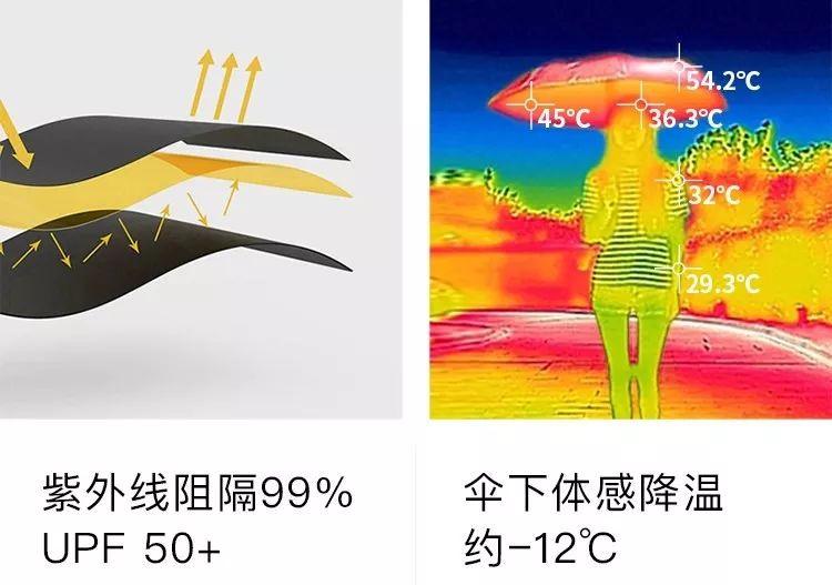 這種材質(zhì)也能阻擋熱量。蕉下自己做過熱感應(yīng)實(shí)驗(yàn),可以看到用強(qiáng)力的防曬傘,遮熱果可以讓溫度驟降12攝氏度,傘內(nèi)傘外體感簡(jiǎn)直是兩個(gè)世界。
