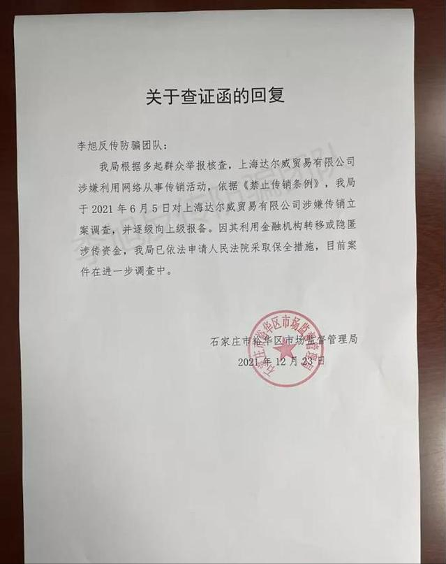 12月29日上午,石家莊市裕華區(qū)市場監(jiān)督管理局回應(yīng)此事稱,此傳銷組織從2013年開始,轄區(qū)內(nèi)涉案人員多,涉案金額比較巨大,從目前的調(diào)查來判斷,這個傳銷組織屬于一種經(jīng)營性傳銷行為,還不足以構(gòu)成詐騙型的傳銷。