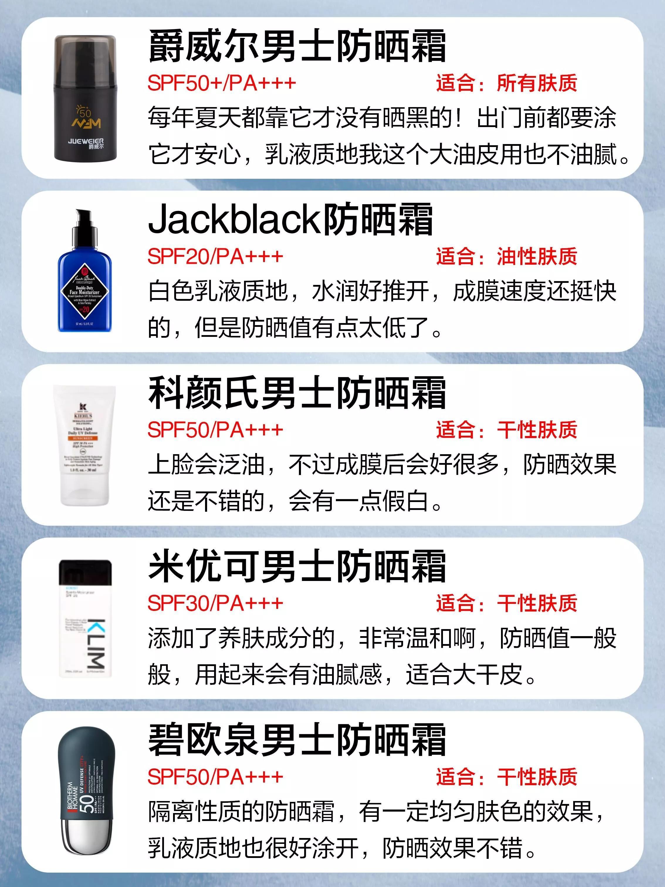 問題七:男士防曬霜哪個牌子的好點(diǎn)? 其實(shí)不用太在意牌子,男士的防曬霜好選擇化學(xué)防曬,摸完物理防曬霜之后整個人白白的會比較娘娘腔哦,區(qū)分化學(xué)防曬和物理防曬只要看成分就知道啦!物理防曬劑主要是二氧化鈦(TiO2)、氧化鋅(ZnO)?;瘜W(xué)防曬劑比較難記,常見的有以下幾種:
