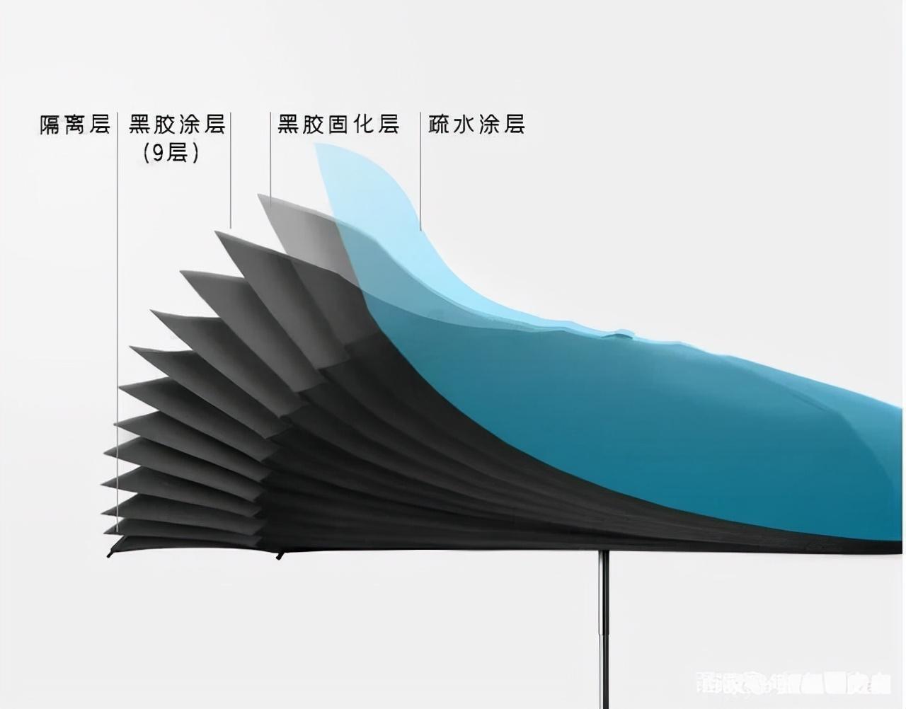 這么高的遮陽才能首要是由于它的9層黑膠涂層隔層和外層210T 70D高密柔布(市面慣例為190T 75D),幫你層層擊潰紫外線。