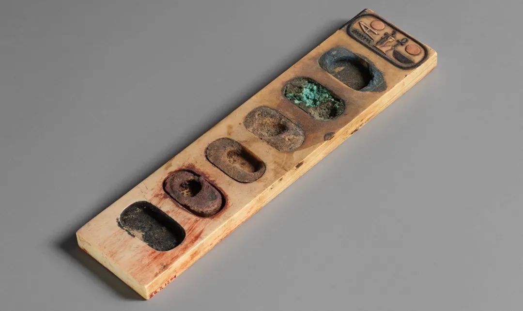 在古埃及圖坦卡蒙國(guó)王墓中,發(fā)現(xiàn)畫(huà)家象牙色的調(diào)色板里,有赭石紅色和其他五種顏色的顏料(圖7)。