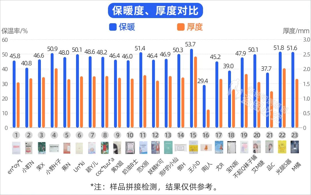 根據(jù)標準 FZ/T 73022-2012《針織保暖內衣》保溫率 ≥30% 的要求看:除了 16 號南J人樣品外,其余保暖性都還不錯。這款是單層的,保暖稍弱一點也正常。