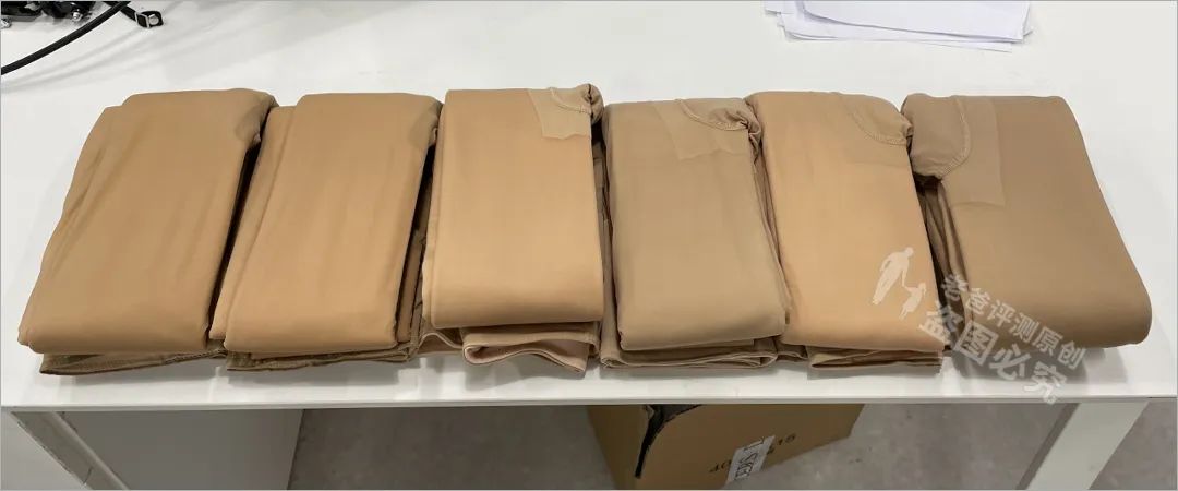 測試時,我們還發(fā)現(xiàn)了件離譜的事。有個品牌,同一款式“同一顏色”的光腿神器,顏色差距竟然大!