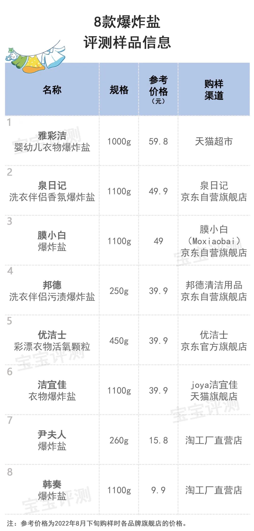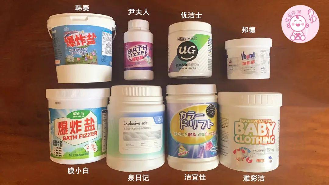 評(píng)測(cè)樣品綜合電商、短視頻、直播等平臺(tái)的銷量情況,笨爸爸選擇了8款熱銷的爆炸鹽作為評(píng)測(cè)樣品,包括:雅彩潔、泉日記、膜小白、邦德、優(yōu)潔士、潔宜佳、尹夫人、韓奏。