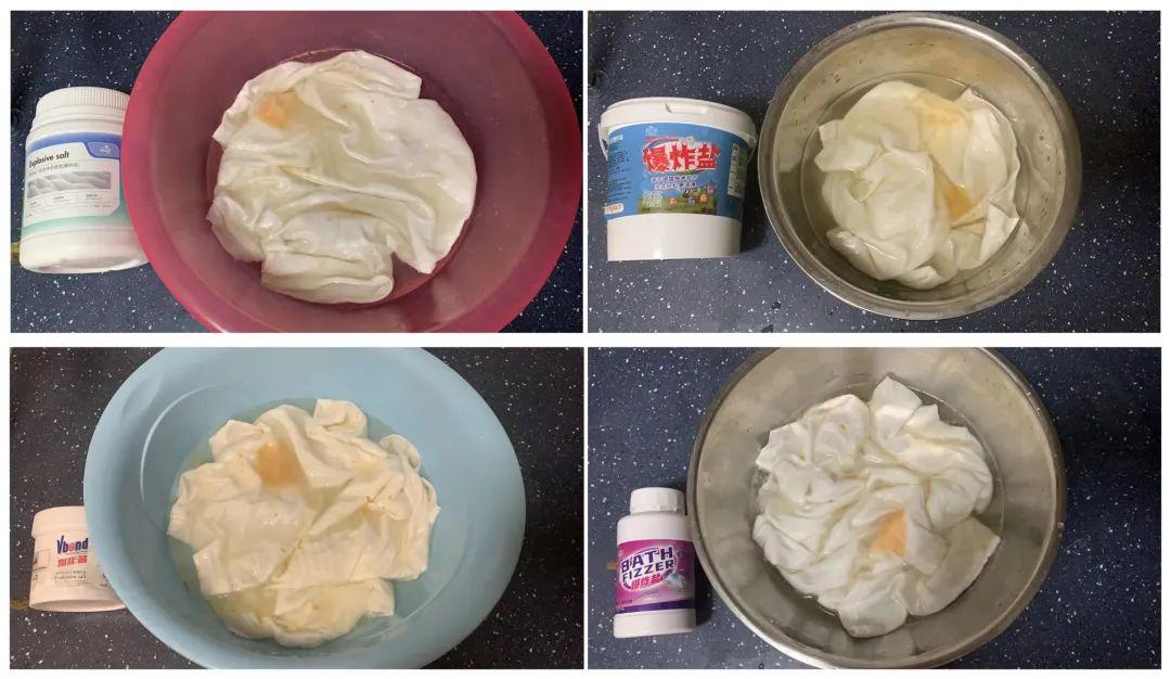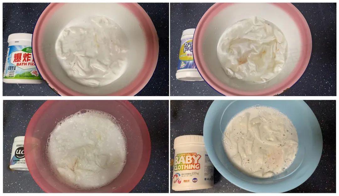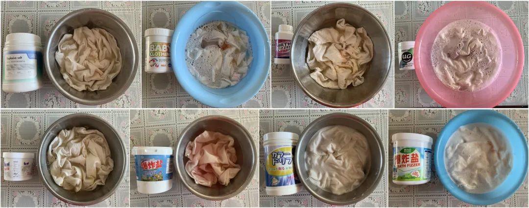 ③爆炸鹽的使用方法主要有:與洗衣液混用、直接浸泡、直接噴灑等,本次評(píng)測(cè)選擇的是直接浸泡法,這是很多爆炸鹽商家在宣傳“奇”時(shí)說(shuō)得多的。