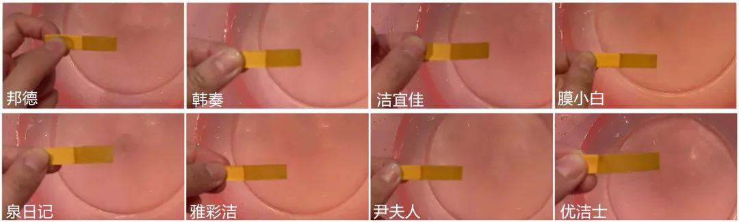 4、第三次漂洗后,各盆中液體的pH檢測(cè)值均在7左右,接近中性,白T摸起來(lái)沒(méi)有的滑膩感,說(shuō)明8款爆炸鹽基本都已漂洗干凈。