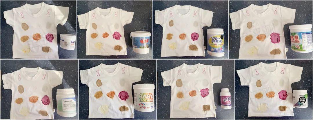 ②在相同的純棉白T上,等量均勻涂抹9種污漬,靜置12小時(shí)待污漬完全變干。