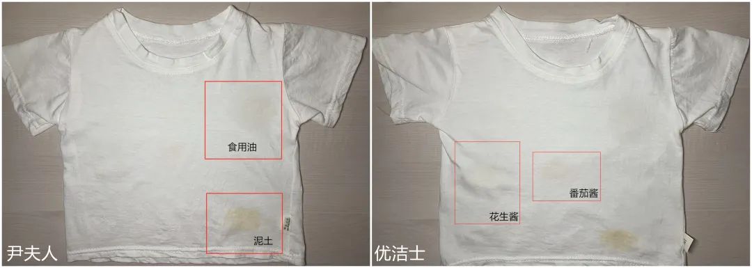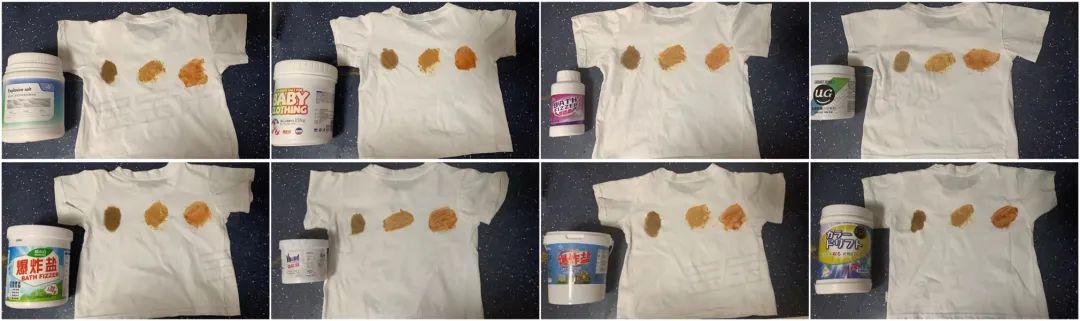 2、食用油、花生醬、番茄醬、泥土,對(duì)于這4種污漬,8款爆炸鹽都未能徹底洗凈,多少都?xì)埩袅艘恍┪蹪n痕跡,特別是泥土、食用油和花生醬。