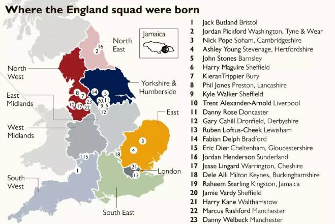 12:英格蘭23人出生地,約克夏郡有7人多。