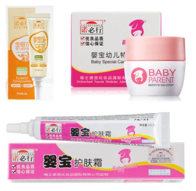 不合格項目:①1批次諾必行?金銀花嬰兒修護膏,檢出違禁成分咪康唑;2批次諾必行?嬰寶幼兒特護膏、1批次諾必行?嬰寶護膚霜,檢出違禁成分苯海拉明、克霉唑。