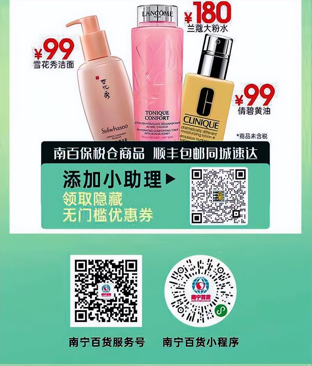 另外,即日起至4月8日,進(jìn)入南寧百貨大樓微信小程序,線上購進(jìn)口護(hù)膚品享好價低扣,蘭蔻粉水低至180元,倩碧黃油低至99元。南百保稅倉同城發(fā)貨,順豐包郵到家。