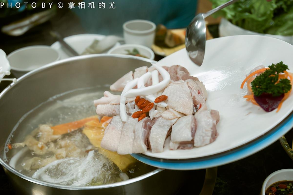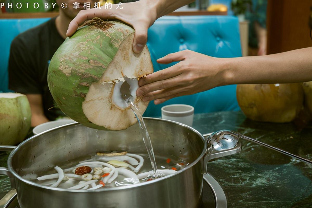 ??我們點的花膠木瓜椰子雞,膠原滿滿地,養(yǎng)顏美容,湯汁更美味。三個椰子一只文昌雞,和椰肉、花膠、木瓜,珍珠馬蹄、枸杞、紅棗、五指山毛桃等珍貴食材一起煮。喝的是食材本身熬制的湯汁。先喝湯,再吃肉。