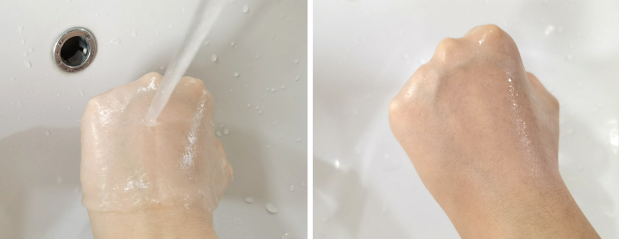 涂抹之后即成膜,在使用防曬的手背上倒水,水珠被隔離,水珠流下未成乳白色,防水、防汗性強(qiáng)。