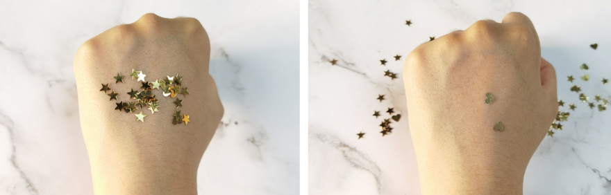 涂抹防曬后,撒上碎屑,左右晃動(dòng),測(cè)試其粘膩度,碎屑掉落,使用清爽。