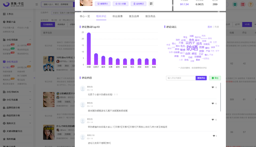 果集·千瓜數(shù)據(jù)分析花西子防曬筆記中,“帶防曬值的妝前霜太省心了”、“遮毛孔果不錯耶”、“敏感肌也可以用呀,表示敏感肌找到款好用的防曬太難了”等好評不斷,多合一的防曬產(chǎn)品備受消費者的喜愛。