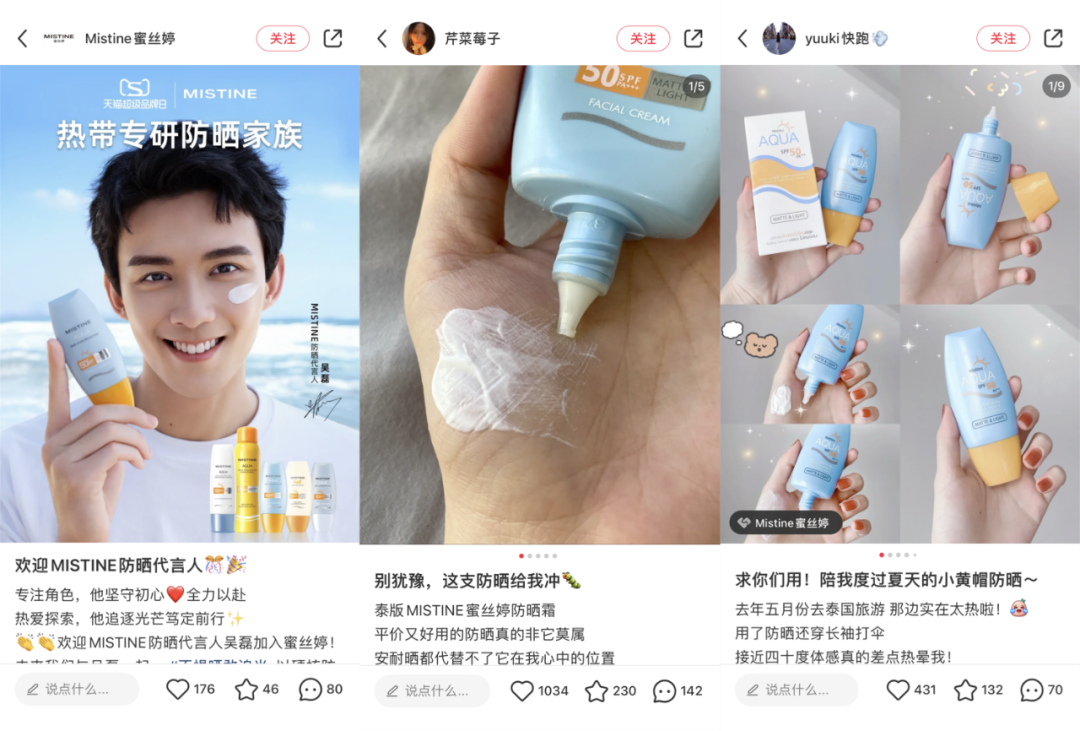 小紅書防曬種草老生常談的產(chǎn)品中,“Mistine蜜絲婷”作為泰國國民品牌,常年雄踞泰國美妝,“Mistine蜜絲婷防曬霜”更是在小紅書上廣受好評,產(chǎn)品平價親民,且泰國位于亞熱帶,常年高溫高濕,紫外線輻射強,蜜絲婷做到了物理加化學雙重防曬SPF50+ ,高倍防護的同時添加了皺波角叉菜與甘蔗復合提取物協(xié)同養(yǎng)膚。