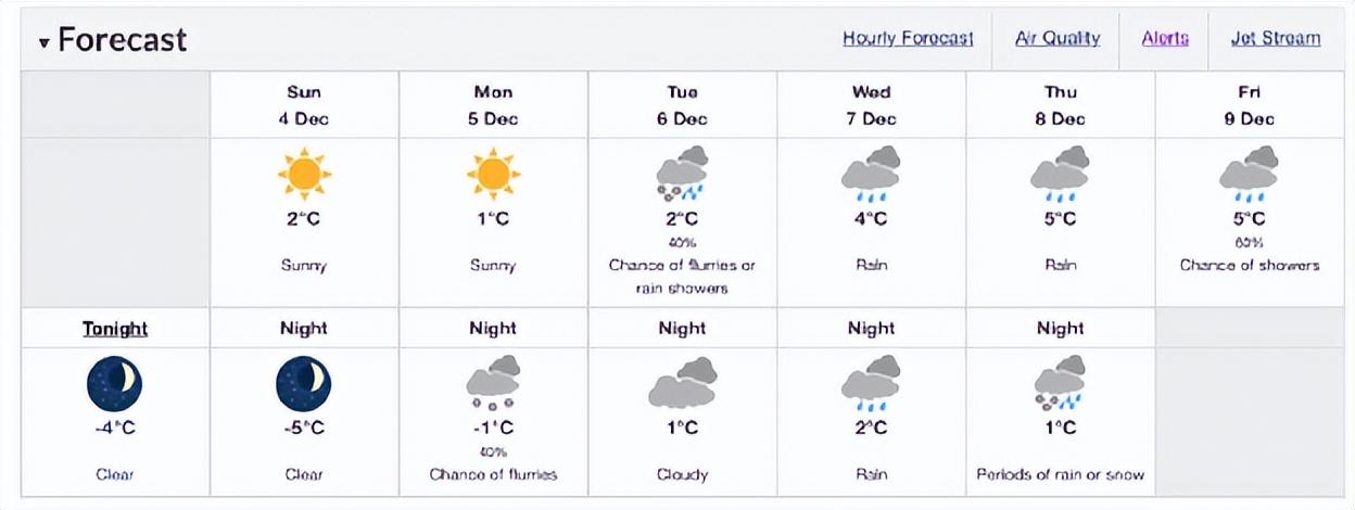 據(jù)加拿大環(huán)境部預測,大溫哥華地區(qū)在接下來的一周里天氣仍然寒冷,白天氣溫低至1°C ,夜晚氣溫低至-5°C。預計大溫周一晚和周二白天或迎來降雪。