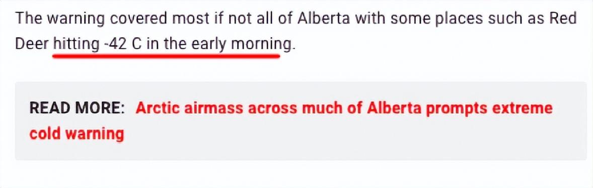 一早一晚是寒冷,在阿省的Red Deer,凌晨氣溫更是達到-42攝氏度。