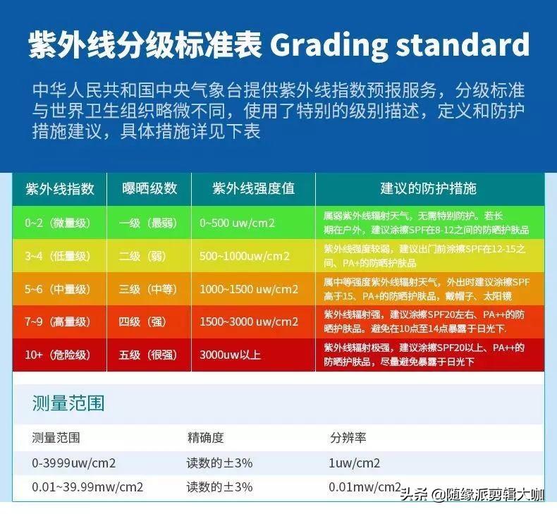 在測試之前,我們先來了解一個專業(yè)詞:紫外線強度值。強度值越高,表示紫外線輻射越強。▼