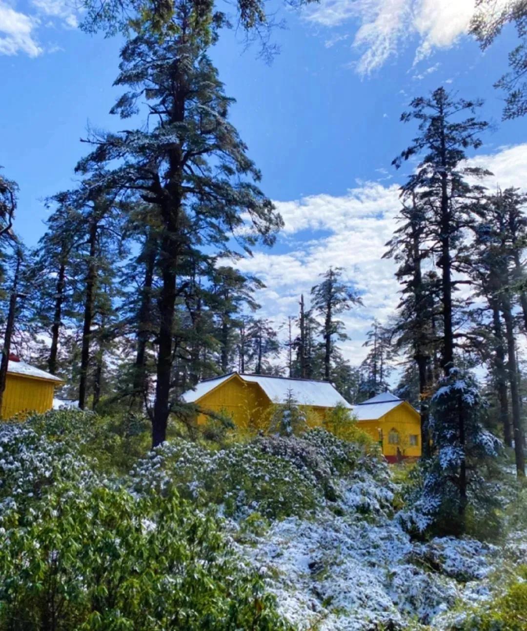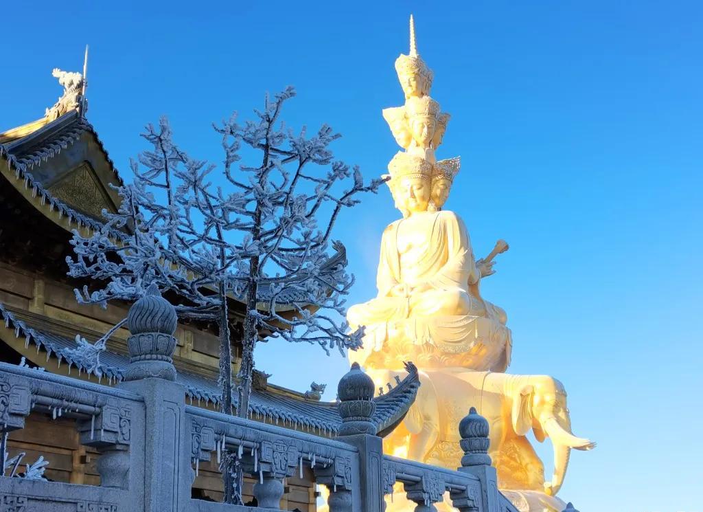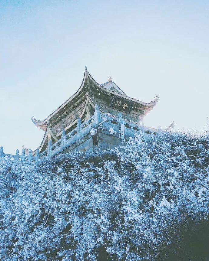 金頂一夜之間“白了頭”,房頂上、草叢中、樹枝間,到處也都鋪了一層白雪,高山上的寺廟也更添了一絲禪意。