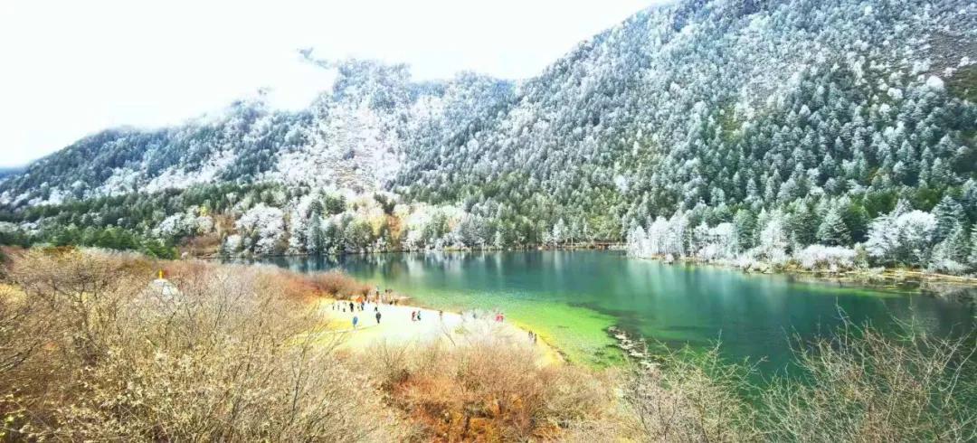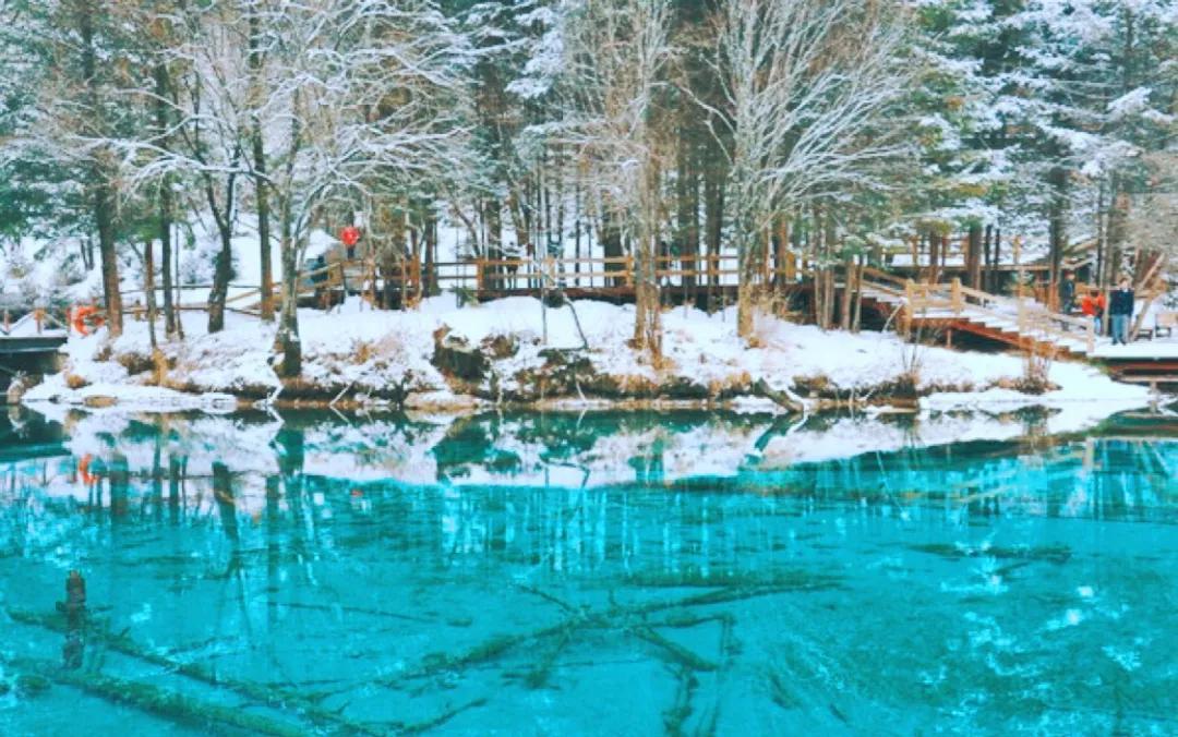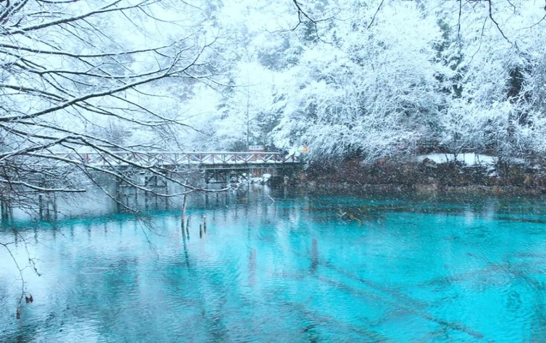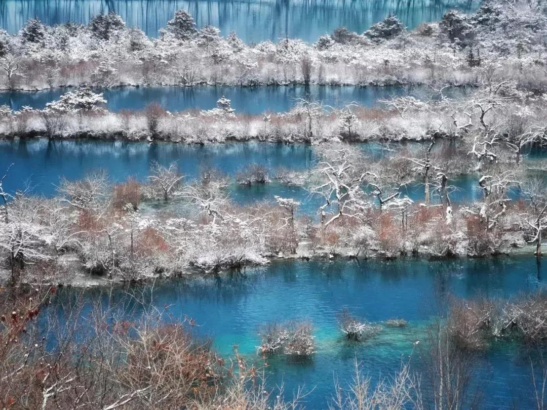 飄飄灑灑的雪,散落在木格措圣湖、七色海、黃金海岸、藥池沸泉……把這里裝點成了一處純潔晶瑩的人間仙境。