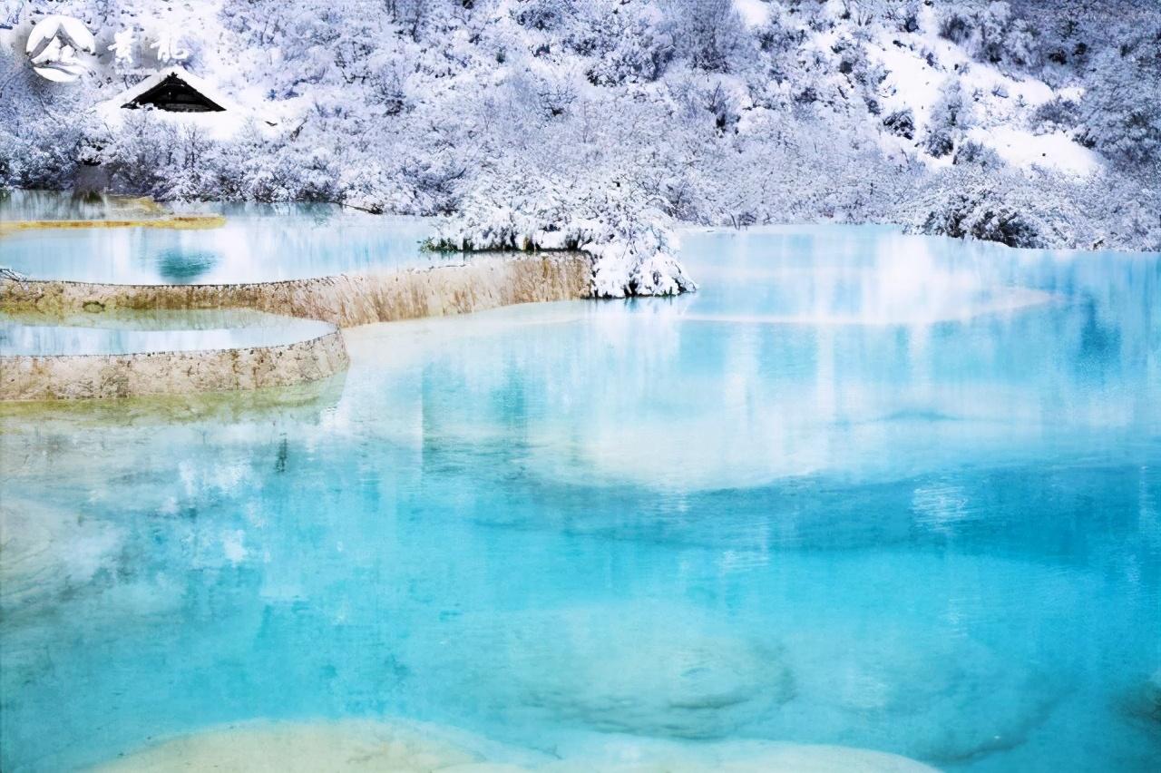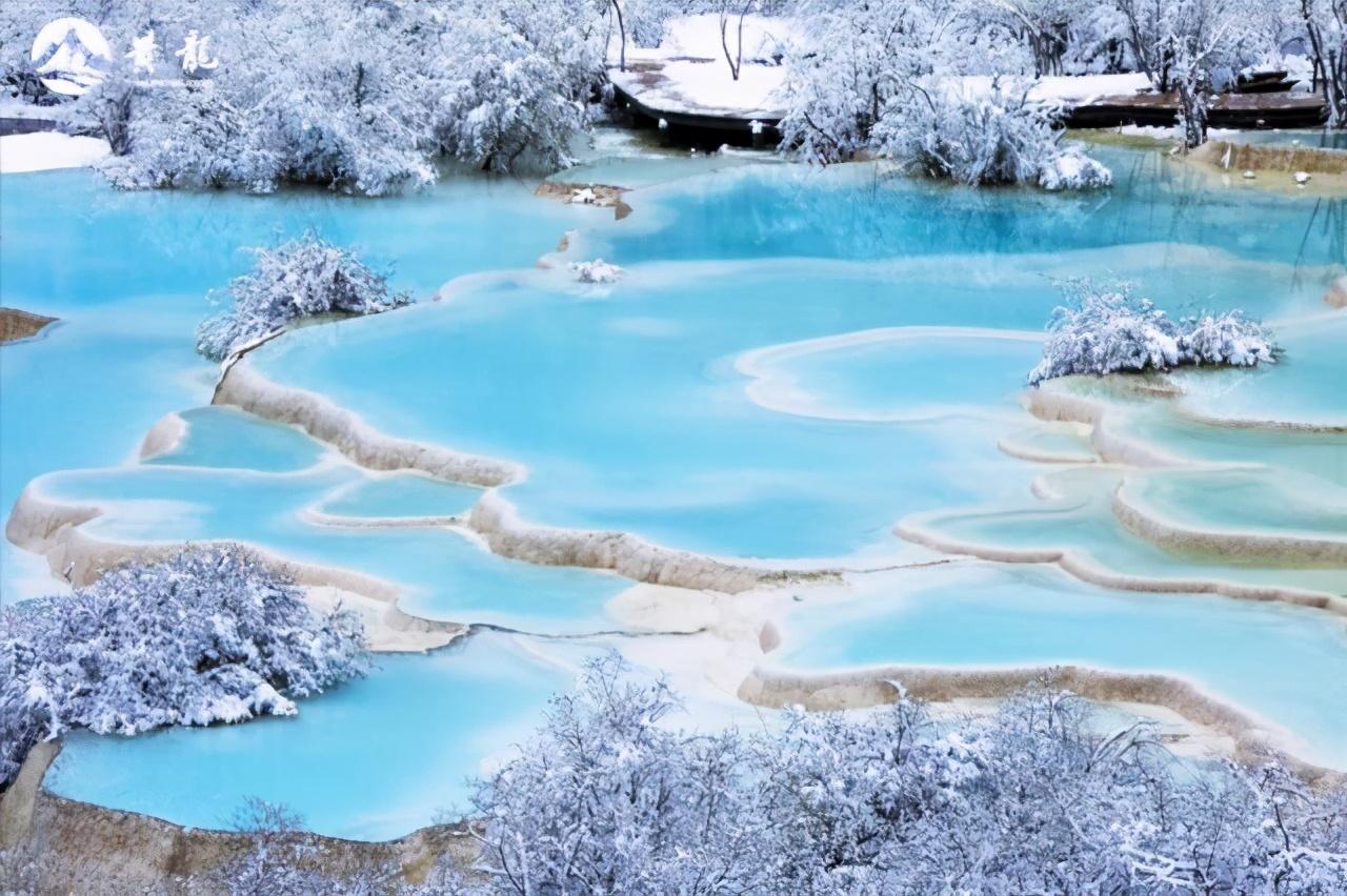 當(dāng)紛飛的白雪輕揚在上空,被這群山簇擁著的鈣化池,也變得小巧玲瓏起來,藍白分明又融合,美得不似在人間。