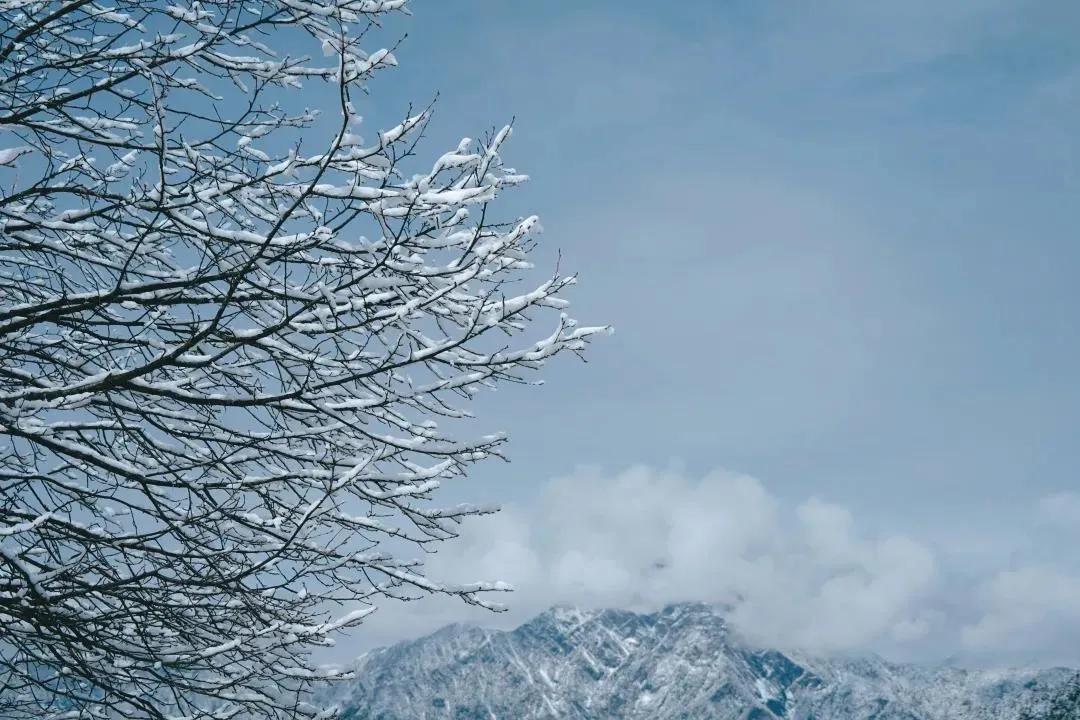 近處是白雪壓枝頭,點點白雪中映出霜葉的紅,這是不經(jīng)意的細微之美。遠處是白雪覆山頭,皚皚白雪隨山勢而起伏,綿延間勾勒出冬日雪山的壯美。