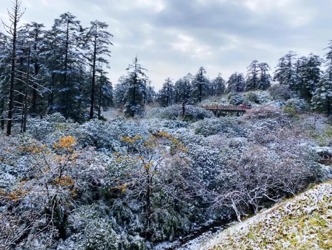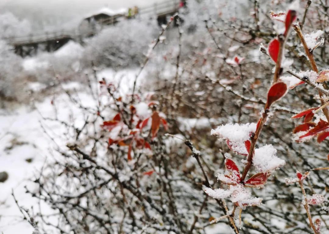 受冷空氣來襲,瓦屋山景區(qū)高山區(qū)22號開始降雪,山頂白雪皚皚、銀裝素裹,山下依舊是層林盡染,呈現(xiàn)出難得一見的秋冬交替時節(jié)美景。
