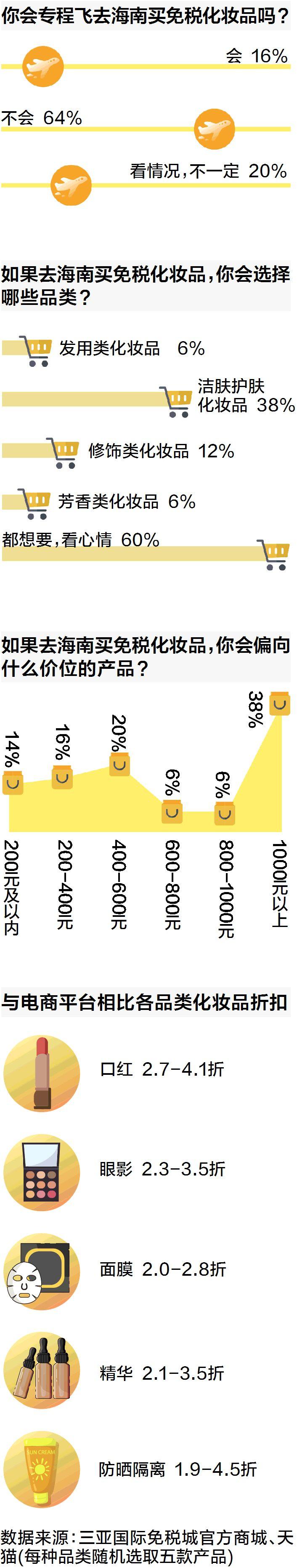 調(diào)查結(jié)果顯示,有64%的受訪者們表示不會專程飛去海南買免稅化妝品,而僅有16%的受訪者們愿意專程赴瓊購物,剩余兩成受訪者們則對此持保留態(tài)度,稱“看情況,不一定”。