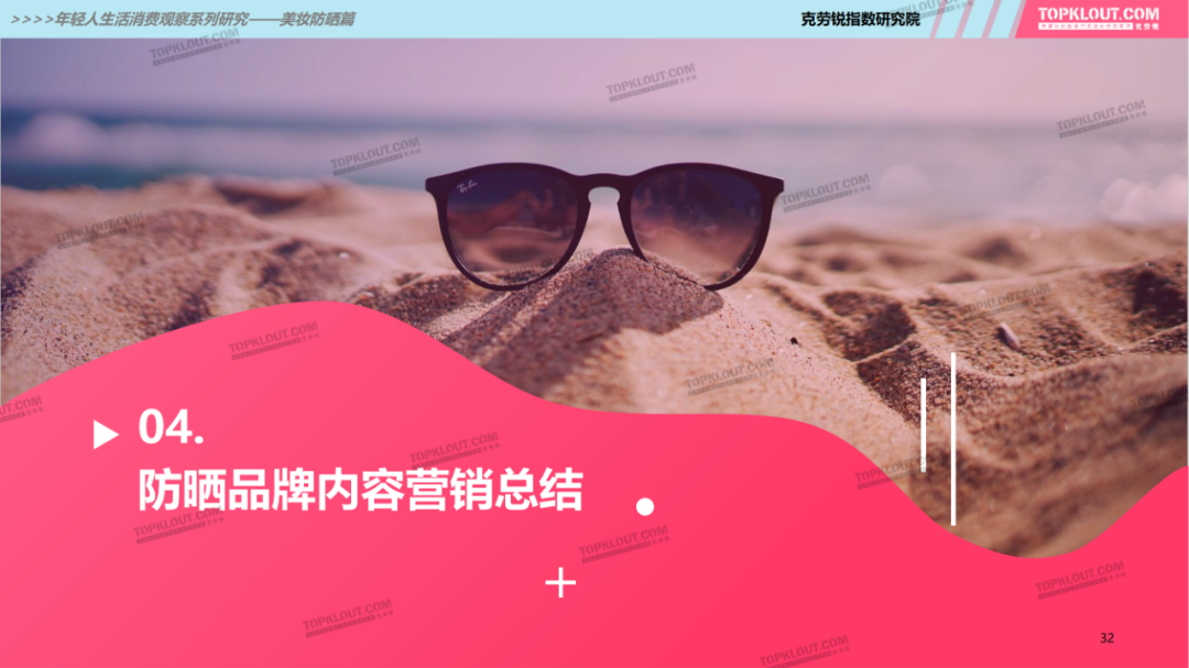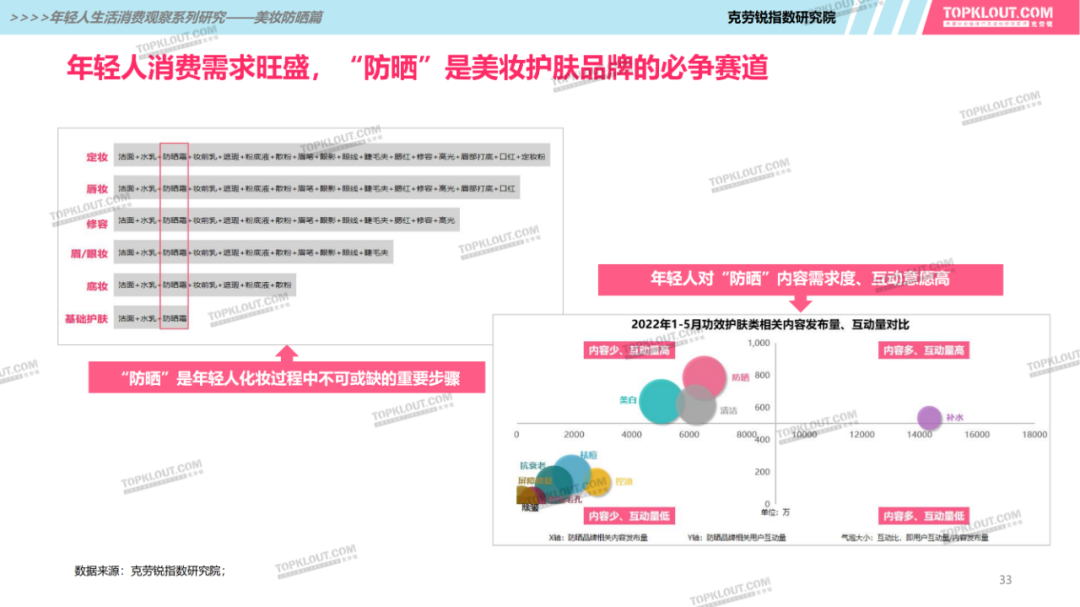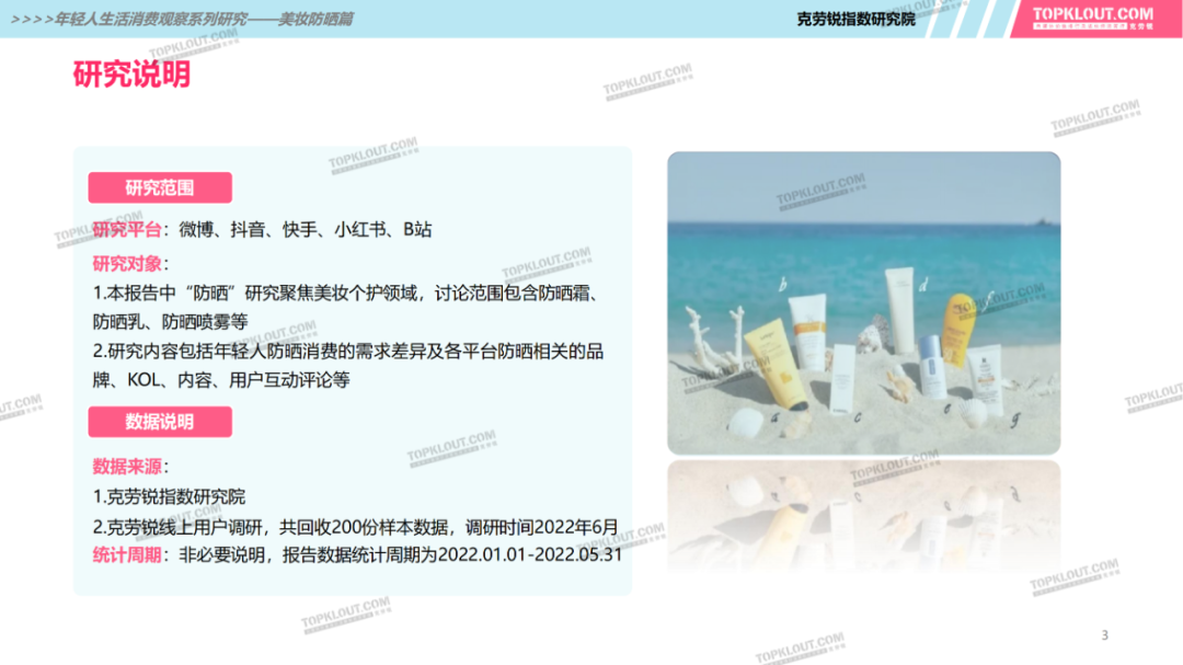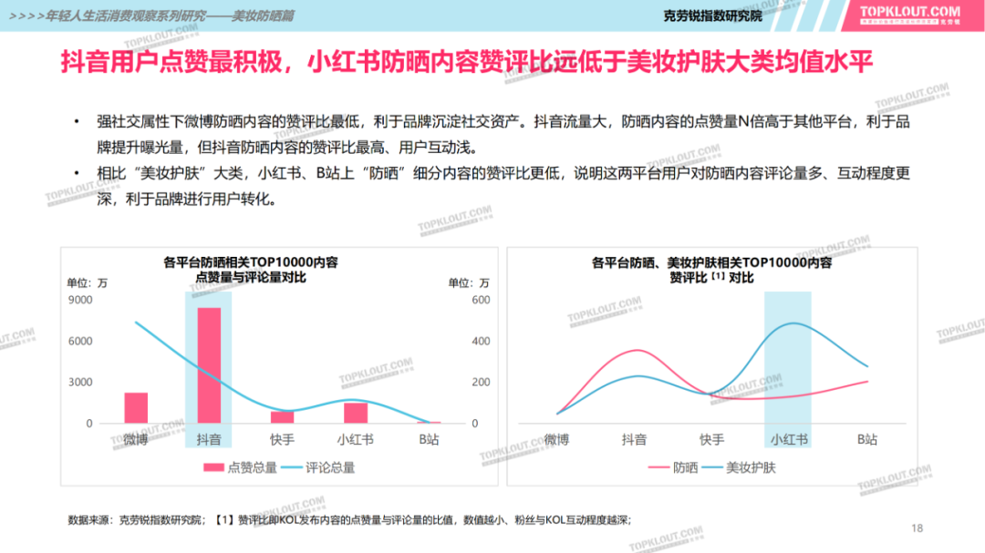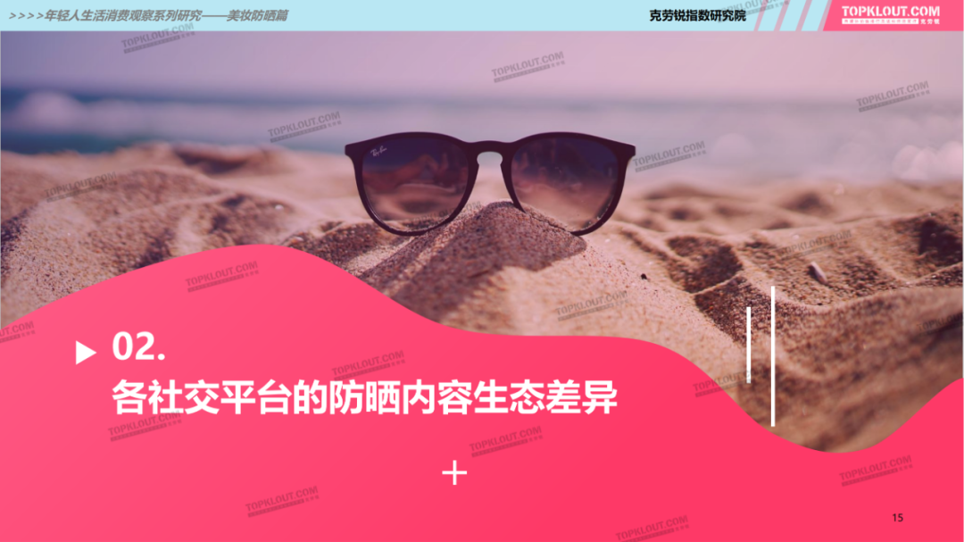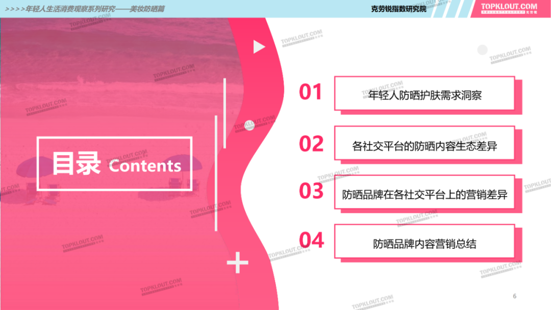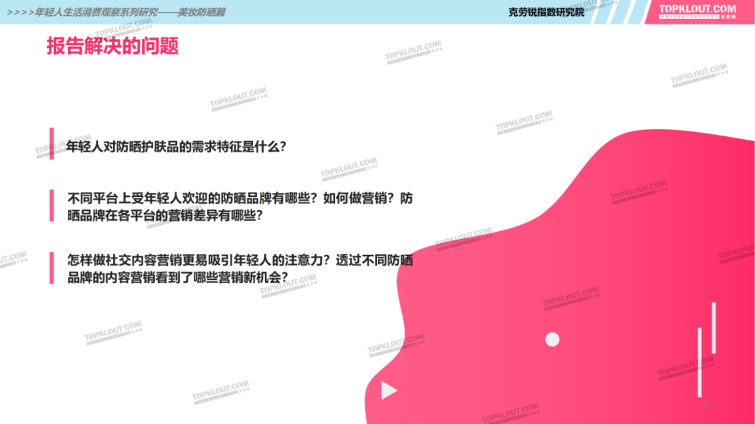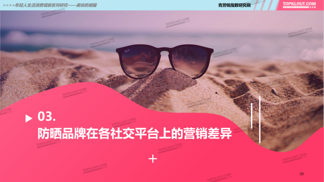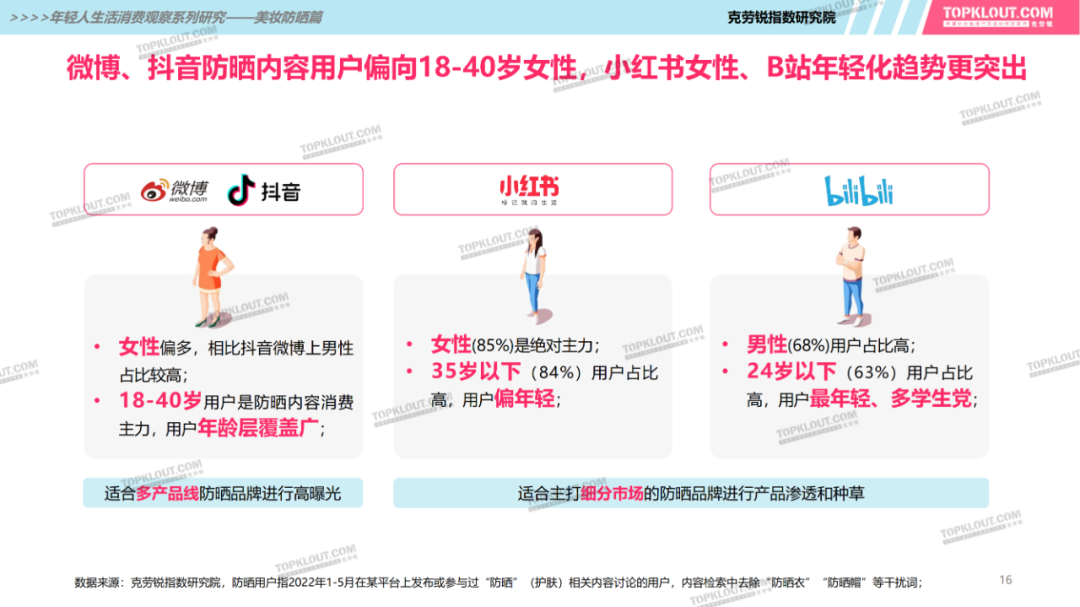 年輕人對(duì)防曬護(hù)膚品的需求特征是什么?不同平臺(tái)上受年輕人歡迎的防曬品牌有哪些?如何做營(yíng)銷(xiāo)?防曬品牌在各平臺(tái)的營(yíng)銷(xiāo)差異有哪些?怎樣做社交內(nèi)容營(yíng)銷(xiāo)更易吸引年輕人的注意力?透過(guò)不同防曬品牌的內(nèi)容營(yíng)銷(xiāo)看到了哪些營(yíng)銷(xiāo)新機(jī)會(huì)?報(bào)告中“防曬”研究聚焦美妝個(gè)護(hù)領(lǐng)域,討論范圍包含防曬霜、防曬乳、防曬噴霧等。研究?jī)?nèi)容包括年輕人防曬消費(fèi)的需求差異及各平臺(tái)防曬相關(guān)的品牌、KOL、內(nèi)容、用戶互動(dòng)評(píng)論等。