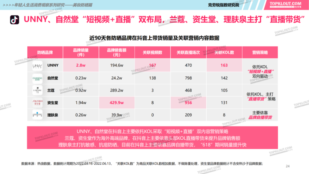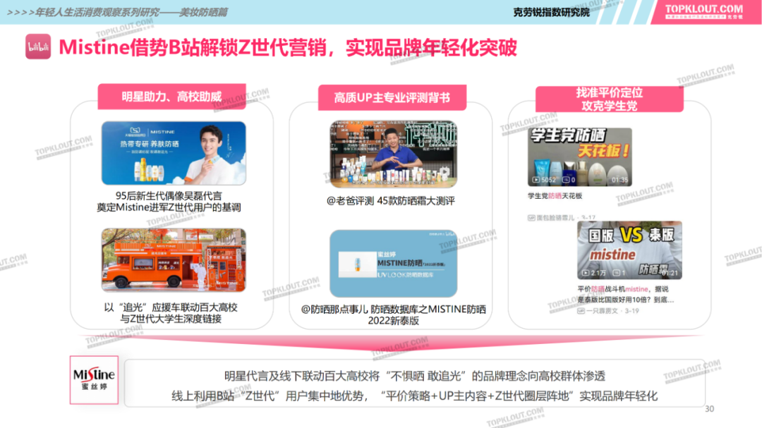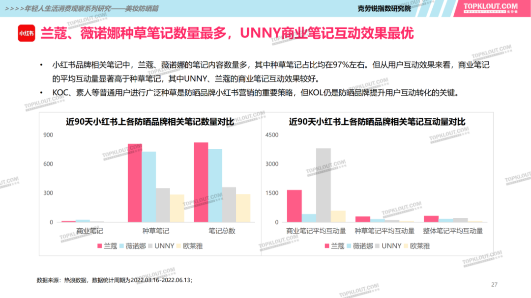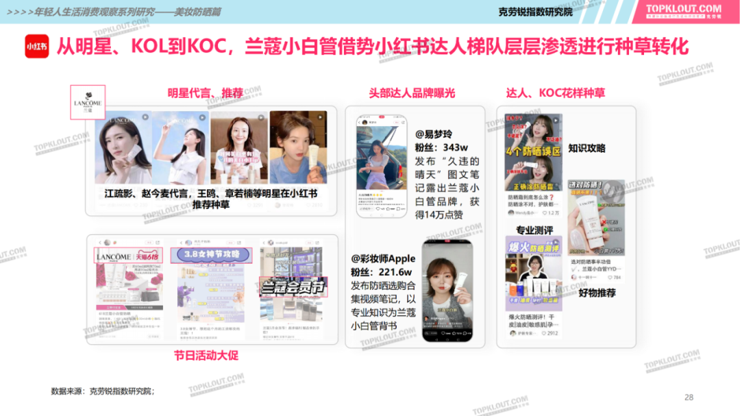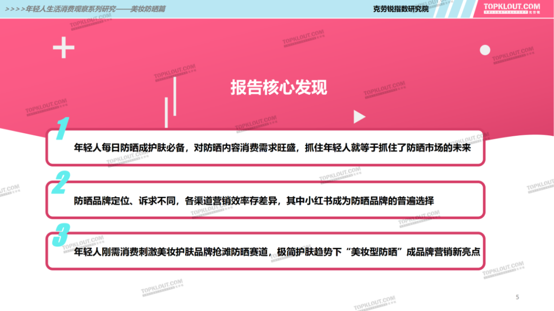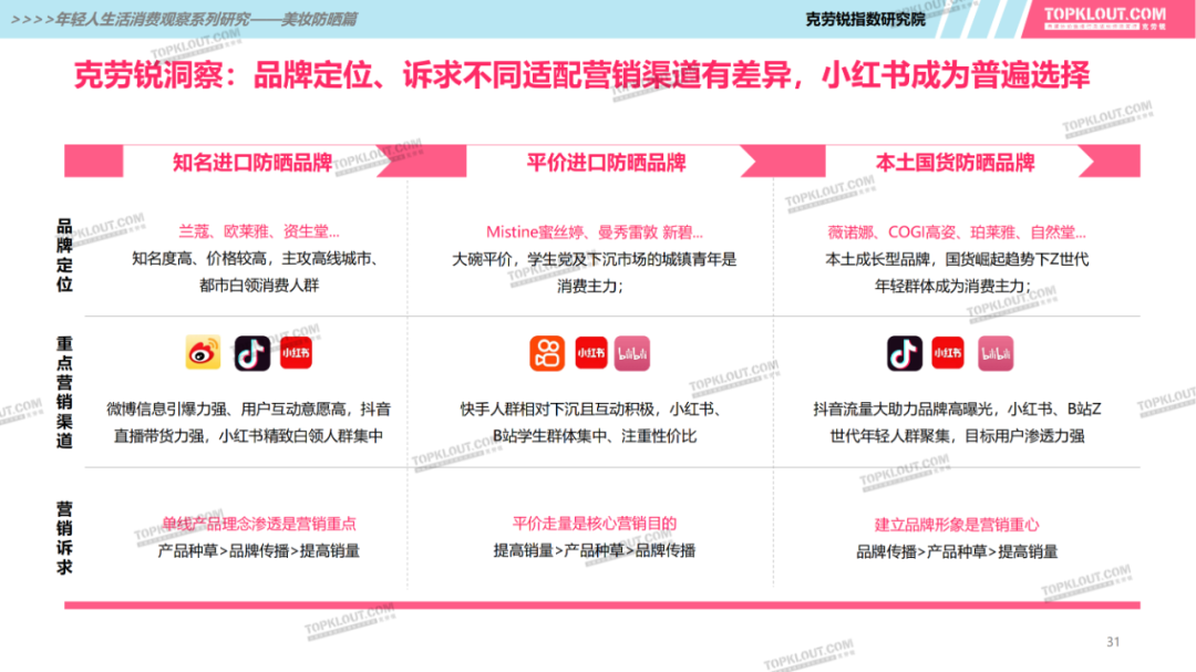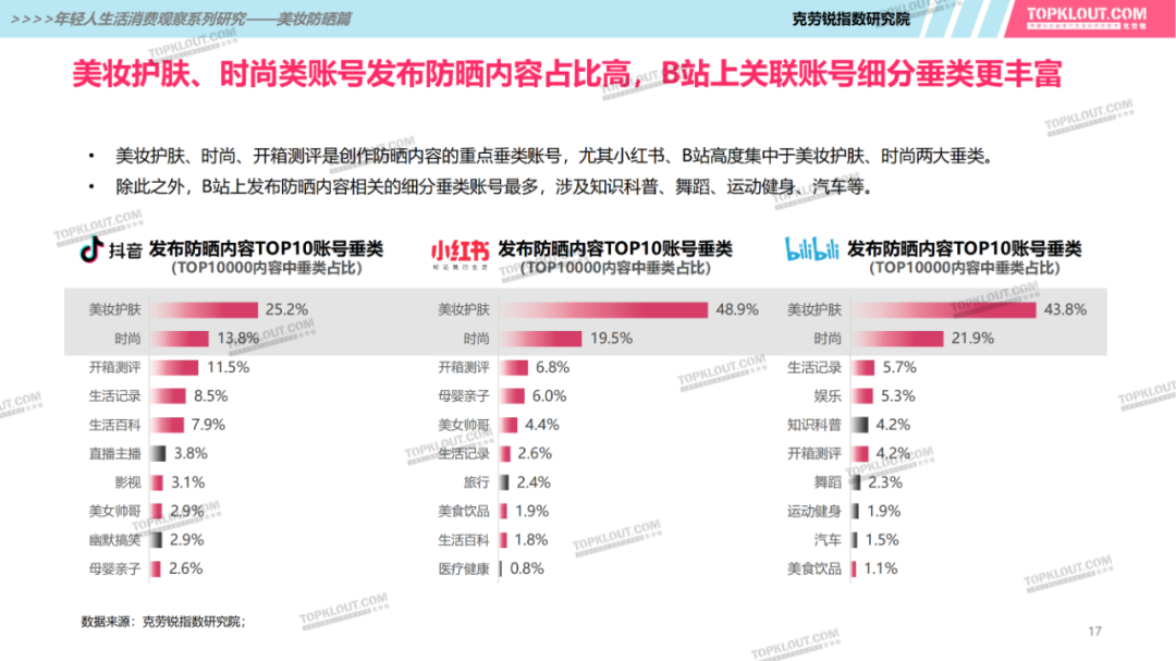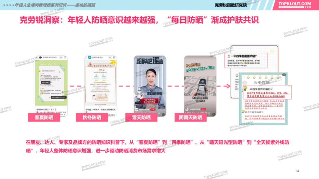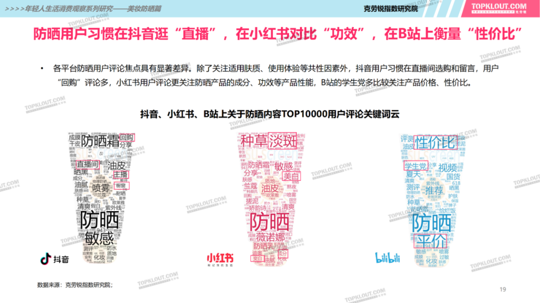 年輕人對(duì)防曬護(hù)膚品的需求特征是什么?不同平臺(tái)上受年輕人歡迎的防曬品牌有哪些?如何做營(yíng)銷(xiāo)?防曬品牌在各平臺(tái)的營(yíng)銷(xiāo)差異有哪些?怎樣做社交內(nèi)容營(yíng)銷(xiāo)更易吸引年輕人的注意力?透過(guò)不同防曬品牌的內(nèi)容營(yíng)銷(xiāo)看到了哪些營(yíng)銷(xiāo)新機(jī)會(huì)?報(bào)告中“防曬”研究聚焦美妝個(gè)護(hù)領(lǐng)域,討論范圍包含防曬霜、防曬乳、防曬噴霧等。研究?jī)?nèi)容包括年輕人防曬消費(fèi)的需求差異及各平臺(tái)防曬相關(guān)的品牌、KOL、內(nèi)容、用戶互動(dòng)評(píng)論等。