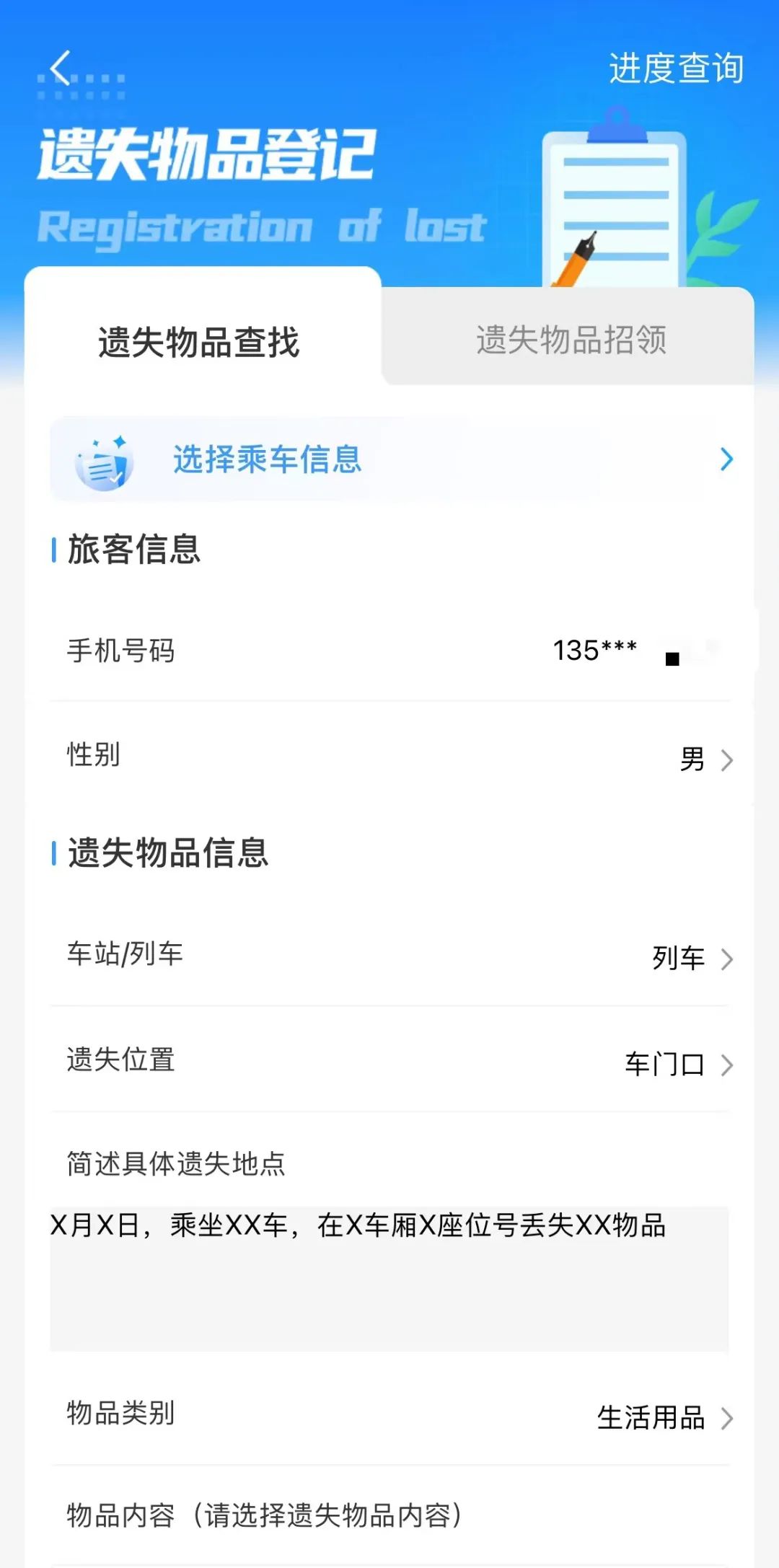 為了更準確識別和尋回遺失物品,旅客盡量詳細提供乘坐列車的車次、車廂號、座位號,遺失物品的位置、品牌、尺寸、顏色、材質等基本信息,一定留好聯(lián)系方式哦!
