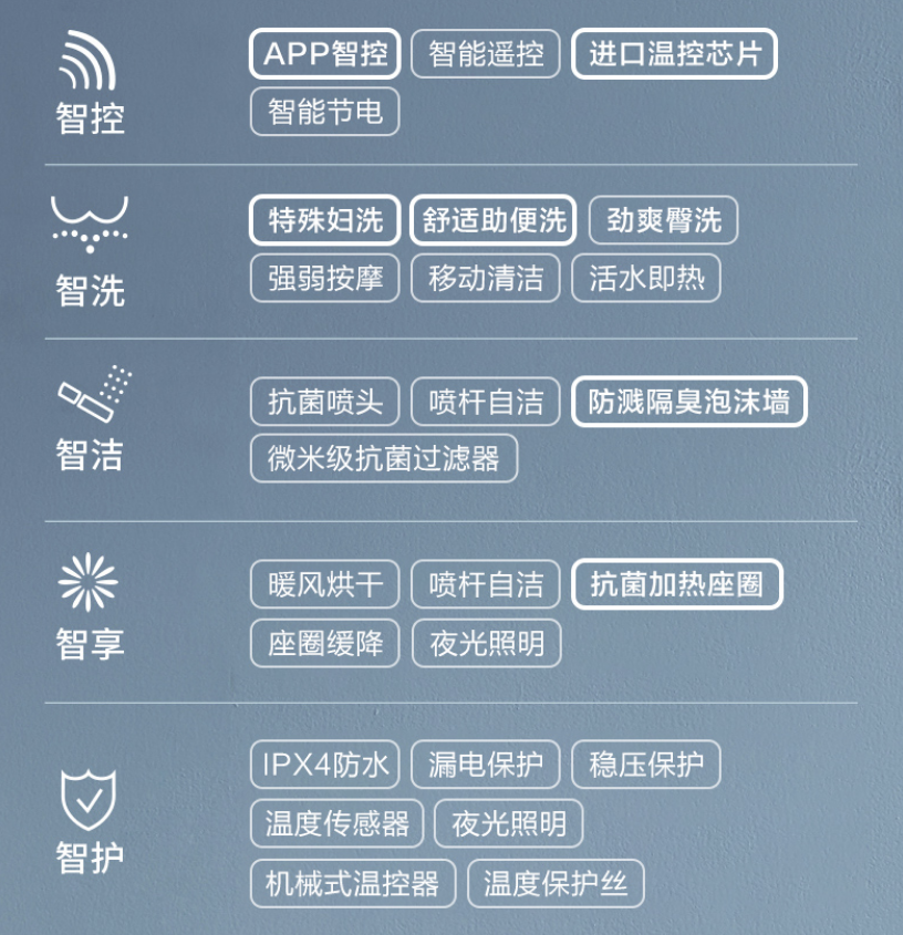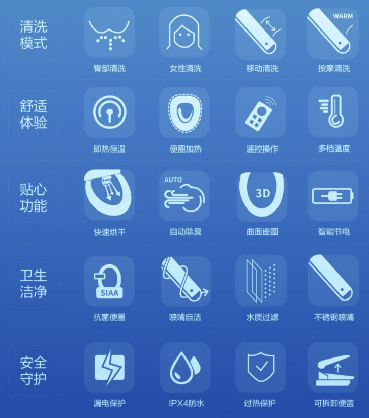 舒適享受:暖風(fēng)烘干、即熱恒溫、便圈加熱、智能除臭;