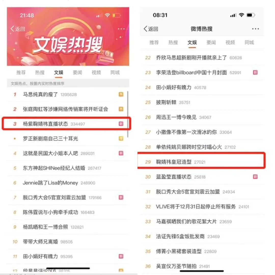 而在鞠婧祎發(fā)起萬人底妝挑戰(zhàn)賽之后,11月1日和2日,鞠婧祎在直播間展示的“皇冠造型”連續(xù)兩次登上微博熱搜。#鞠婧祎直播狀態(tài)#和#鞠婧祎妝容造型#兩大話題累計(jì)閱讀量超3.2億次,引發(fā)近10萬量級的討論。