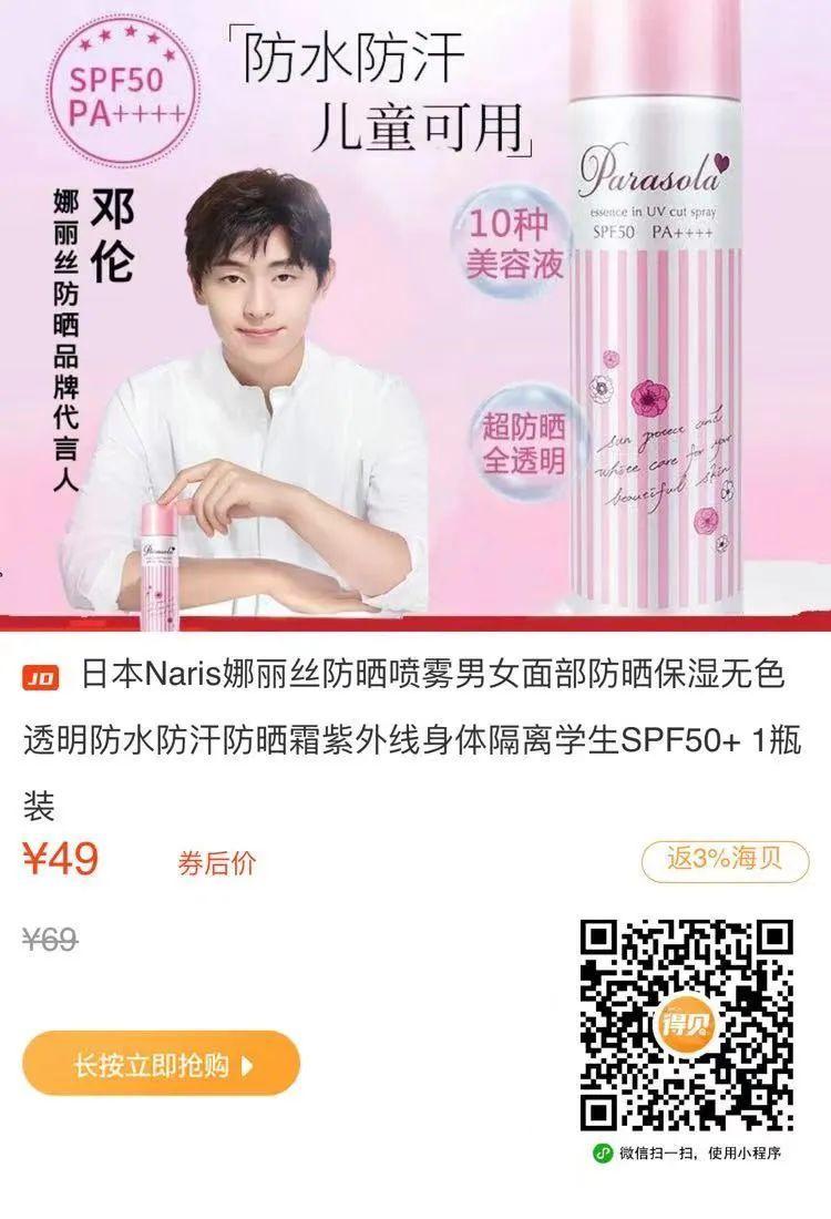 第二款,娜麗絲防曬噴霧鄧倫代言同款防曬噴霧,日本高端,防曬又保濕!目前單件到手價(jià)49元!返3.34海貝(≈2.6元)
