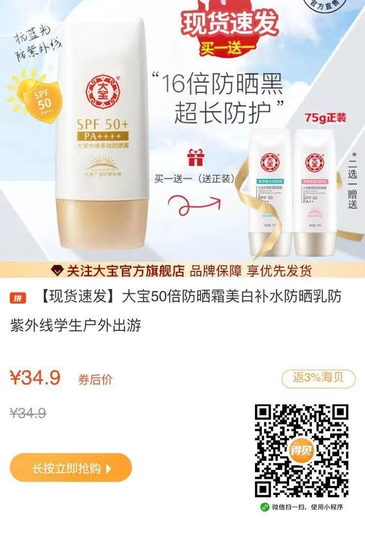 第四款,大寶防曬霜拼多多大寶官方旗艦店,現(xiàn)買一送一!目前單件到手價(jià)34.9元!返1.07海貝(≈0.79元)
