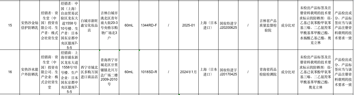 通告顯示,產(chǎn)品標(biāo)簽標(biāo)示為株式會(huì)社資生堂生產(chǎn)、資生堂(中國(guó))投資有限公司經(jīng)銷的“安熱沙金燦倍護(hù)防曬乳”經(jīng)吉林省產(chǎn)品質(zhì)量監(jiān)督檢驗(yàn)院檢驗(yàn),成分比對(duì)不符合規(guī)定,未檢出產(chǎn)品標(biāo)簽及注冊(cè)資料載明的技術(shù)要求標(biāo)示的防曬劑:雙-乙基已氧苯酚甲氧苯基三嗪、二乙氨羥苯甲?;郊姿峒乎ァ⑺畻钏嵋一乎?、奧克立林。