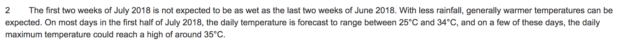 過去兩個星期由于降雨較多,平均氣溫較往年同期有所下降,甚至有九天的低溫在攝氏23度以下,其中低溫一度達21.5度!怪