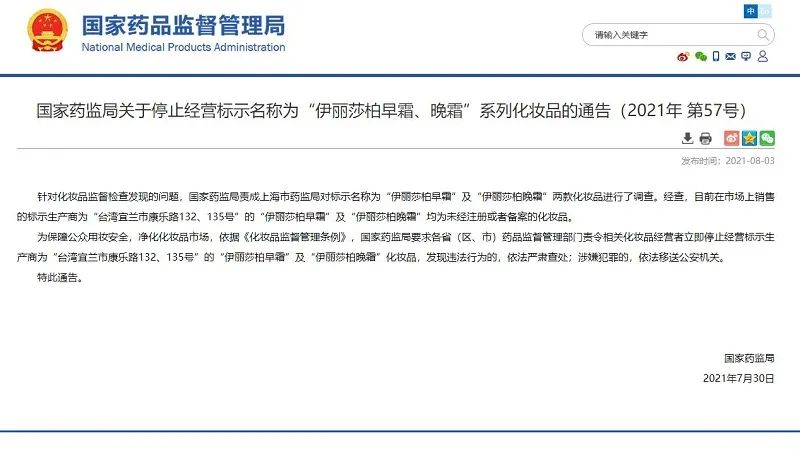 藥品監(jiān)督管理局2021年7月發(fā)布通告查處的“伊麗莎柏早霜、晚霜”就屬于這一情況。這兩款化妝品未經(jīng)注冊(cè)或備案,違規(guī)套用“米契爾美白祛斑霜”(國妝特字20190065)、“幽爽臻白祛斑乳霜”(國妝特字20111108)兩款產(chǎn)品的注冊(cè)編號(hào)進(jìn)行生產(chǎn)銷售,被責(zé)令停止銷售和依法嚴(yán)肅查處。
