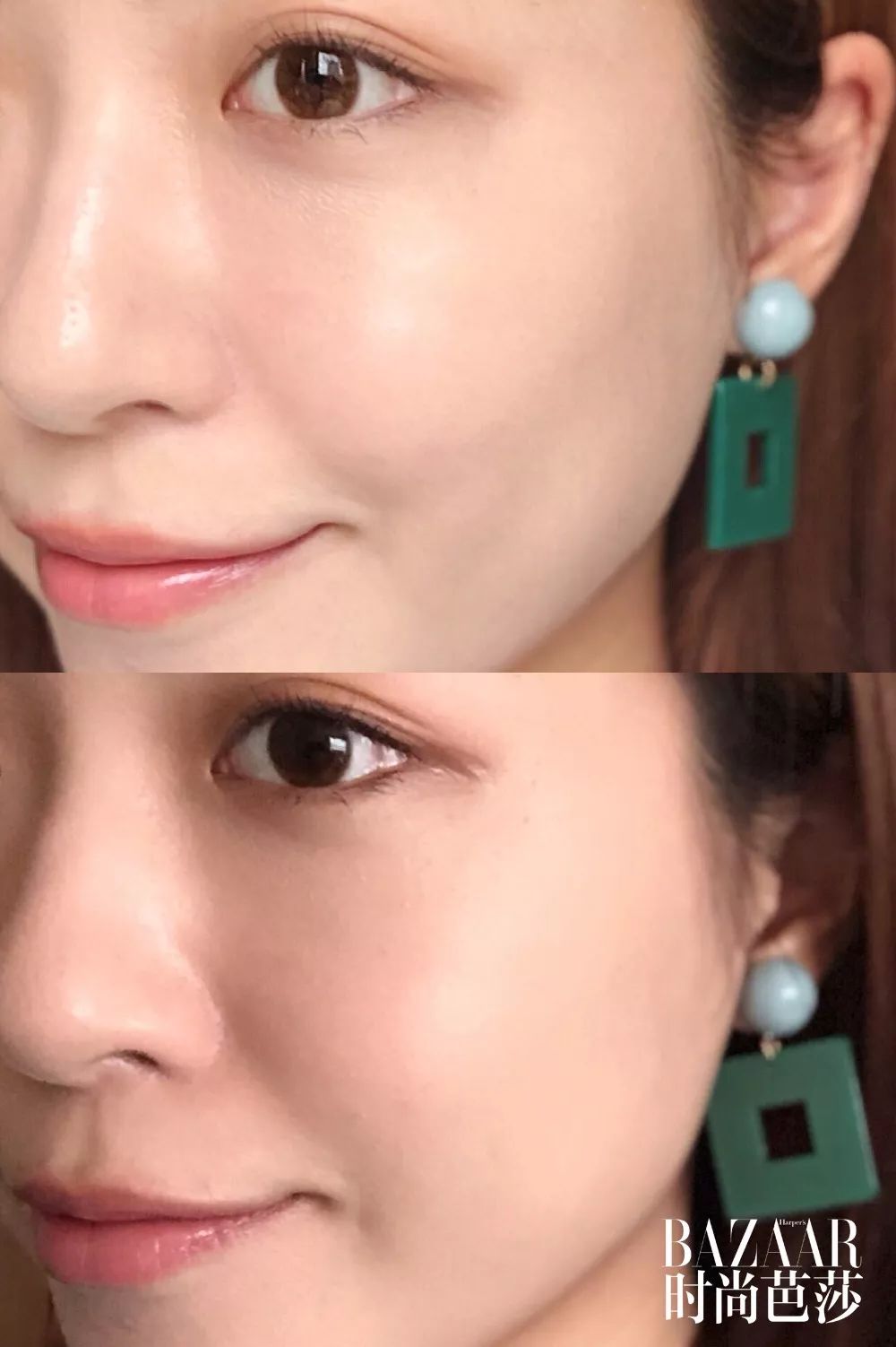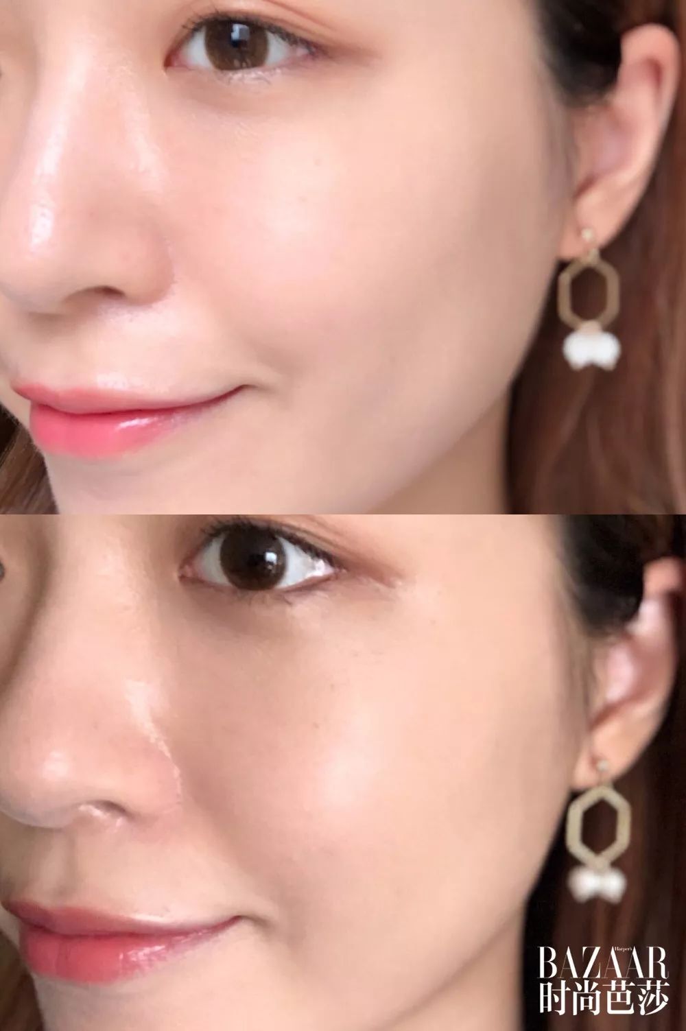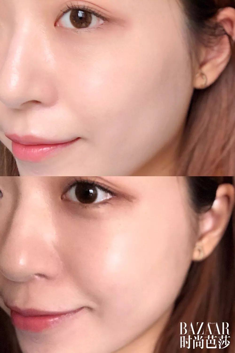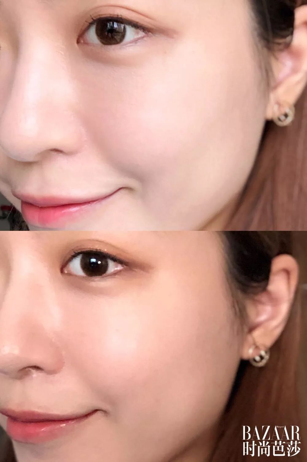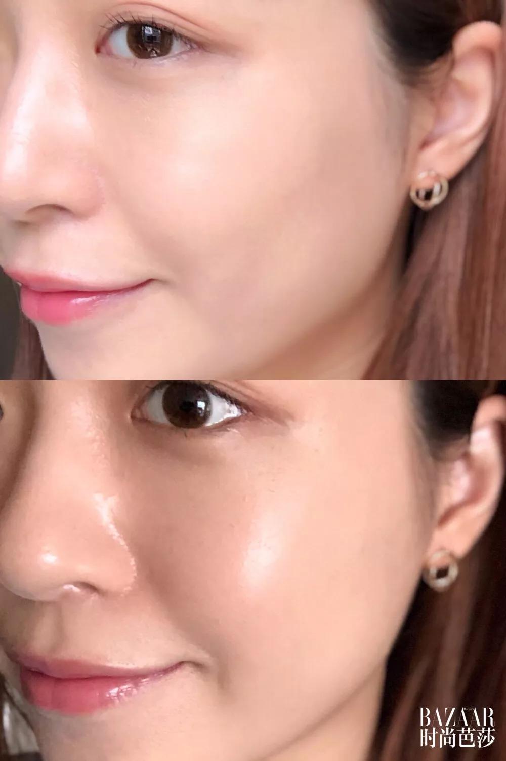 奶油肌妝,就像肌膚自然透出的健康光澤感,妝感清透自然不厚重,持妝6小時有輕微氧化暗沉現(xiàn)象。雖然鼻翼兩側(cè)、額頭、下巴都有出油,但并沒有出現(xiàn)溶妝和斑駁的情況,適合干皮在夏天使用。