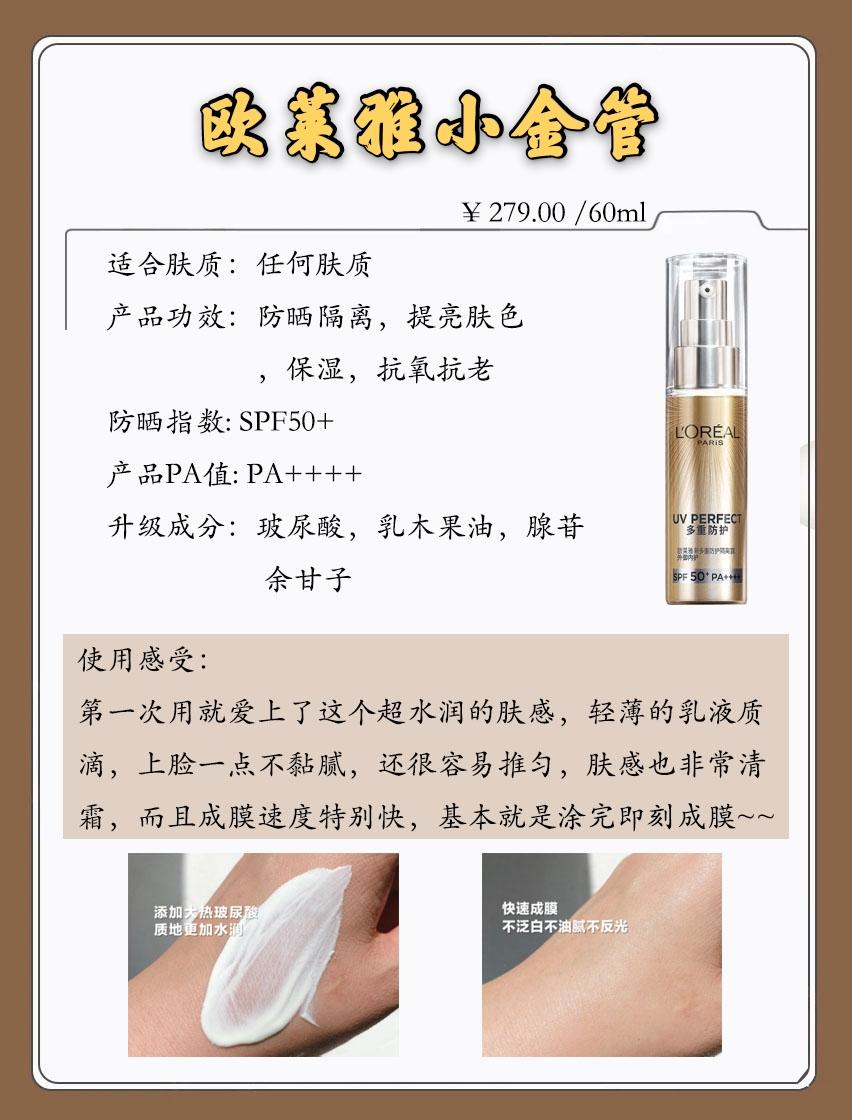 這款小金管的防曬值是50+,太陽再大都夠用,高倍數(shù)的防曬一般都比較油膩,但是小金管還挺潤的,它里面添加了玻尿酸,涂抹在連上是水潤的感覺,成膜速度也很快,很適合化妝女孩~~