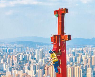 施工人員在重慶陸海國際中心項目主塔樓樓頂進(jìn)行施工作業(yè)。何 超攝(新華社發(fā))