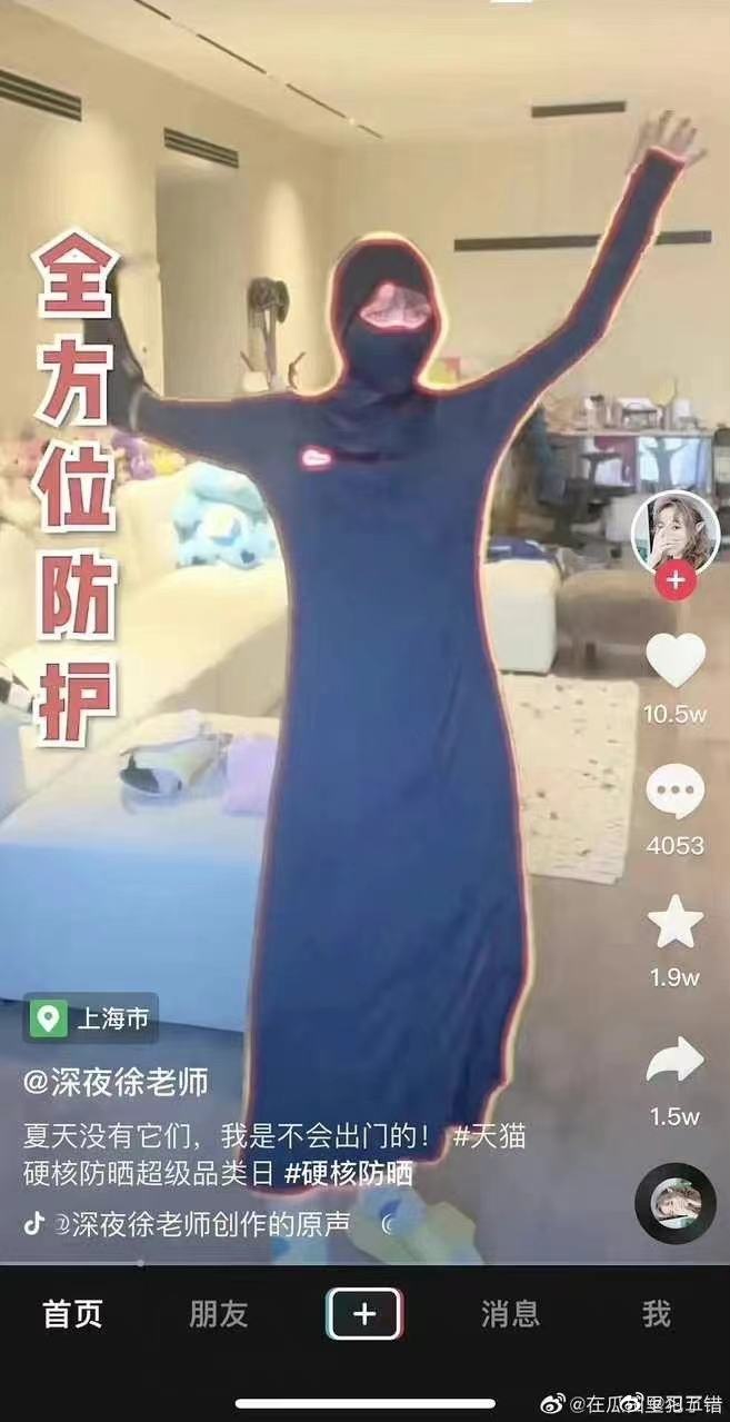 微博網(wǎng)紅“喵子”發(fā)了一張自己穿著黑色長袍的防曬照片,全身上下被遮蓋得嚴(yán)嚴(yán)實(shí)實(shí),連眼睛都看不到。這張照片突然爆紅,即使她后來把照片刪了,依然被網(wǎng)友截圖轉(zhuǎn)發(fā)。在她的微博下集合了眾多“防曬人”的曬圖,可以領(lǐng)略到一個“合格防曬人出門的必備素養(yǎng)”究竟是何種模樣。