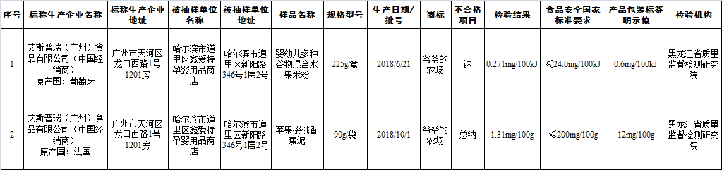 市場監(jiān)管總局2019年6月20日的通報顯示,在黑龍江市場的抽檢中,“爺爺?shù)霓r(nóng)場” 嬰幼兒多種谷物混合水果米粉(225g/盒,2018-6-21,原產(chǎn)國:葡萄牙)鈉指標不達標。