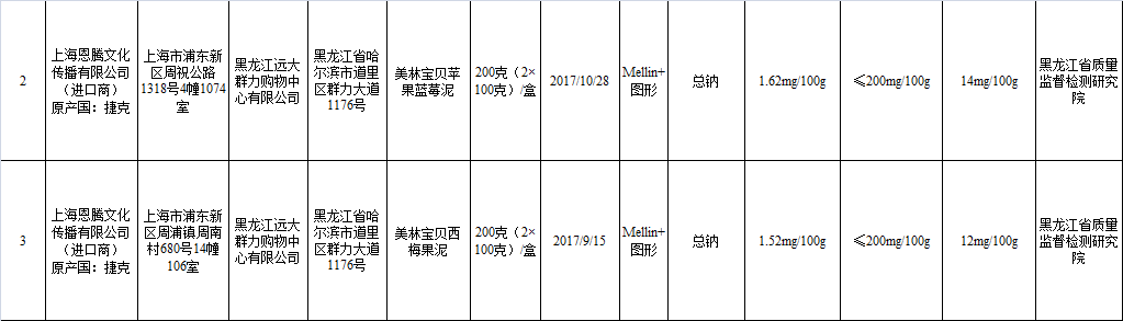 03果泥:美林、小皮、爺爺?shù)霓r(nóng)場不合格市場監(jiān)管總局2019年8月27日的通報顯示,在黑龍江市場的抽檢中,美林寶貝蘋果藍莓泥(原產(chǎn)國:捷克)、美林寶貝西梅果泥(原產(chǎn)國:捷克)各有一個批次產(chǎn)品總納指標不合格。