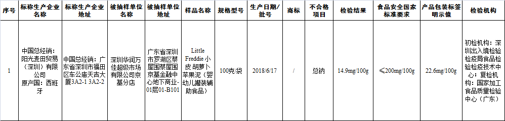 監(jiān)管總局2019年9月9日的通報則顯示,在深圳市場的抽檢中,Little Freddie 小皮的胡蘿卜蘋果泥(原產(chǎn)國:西班牙)一個批次產(chǎn)品的總鈉指標不合格。