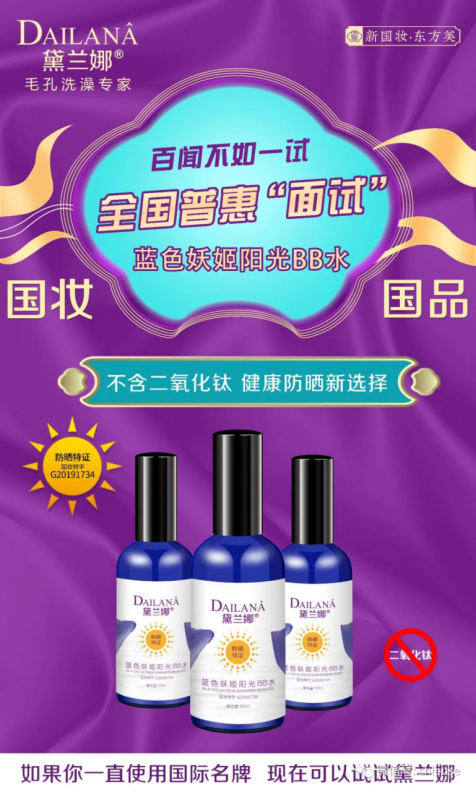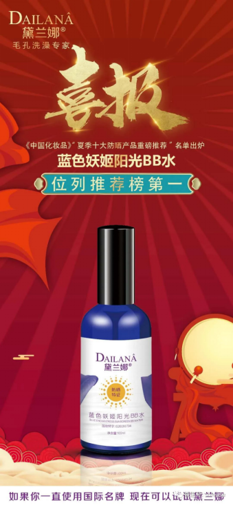 近日,由美容化妝品行業(yè)媒體《中國化妝品》雜志社開展的“夏季十大防曬產(chǎn)品重磅推薦”名單出爐,來自上海東方美谷的黛蘭娜品牌藍(lán)色妖姬陽光BB水從防曬產(chǎn)品中脫穎而出,位列推薦榜第一。