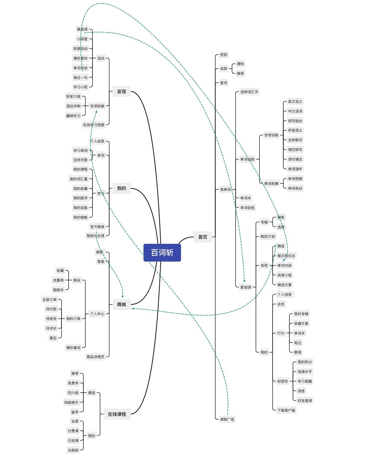 從功能結(jié)構(gòu)圖來看,在百詞斬的產(chǎn)品信息架構(gòu)上,分為“首頁”、“發(fā)現(xiàn)”、“商城”、“在線課程”、“我的”五大模塊。相對于市場上的同類型APP的功能模塊來看,百詞斬屬于功能較多的產(chǎn)品。豐富的功能模塊可以滿足用戶的興奮性需求,但有些功能路徑較深,在不同頁面之間很多交互,操作比較復(fù)雜,使用不夠方便快捷。
