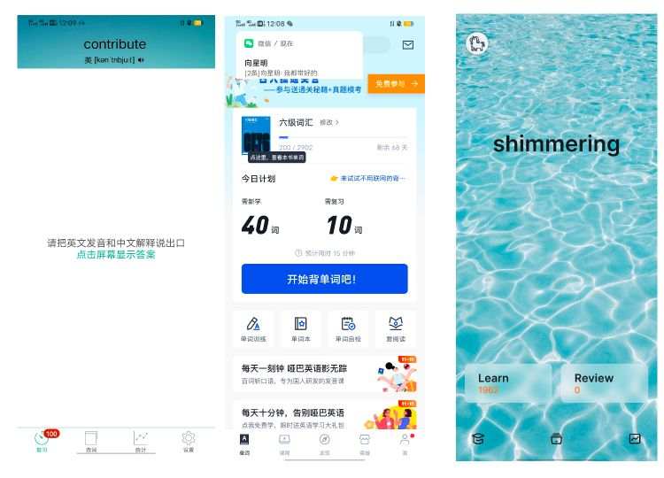圖5 三款A(yù)PP首頁(從左至右分別是墨墨背單詞、百詞斬、不背單詞)