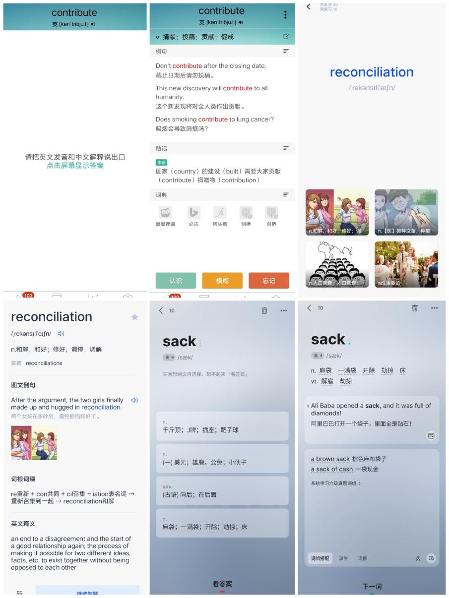 圖6 三款A(yù)PP背單詞頁面(兩張為一組,從左至右從上至下的順序分別是墨墨背單詞、百詞斬、不背單詞)